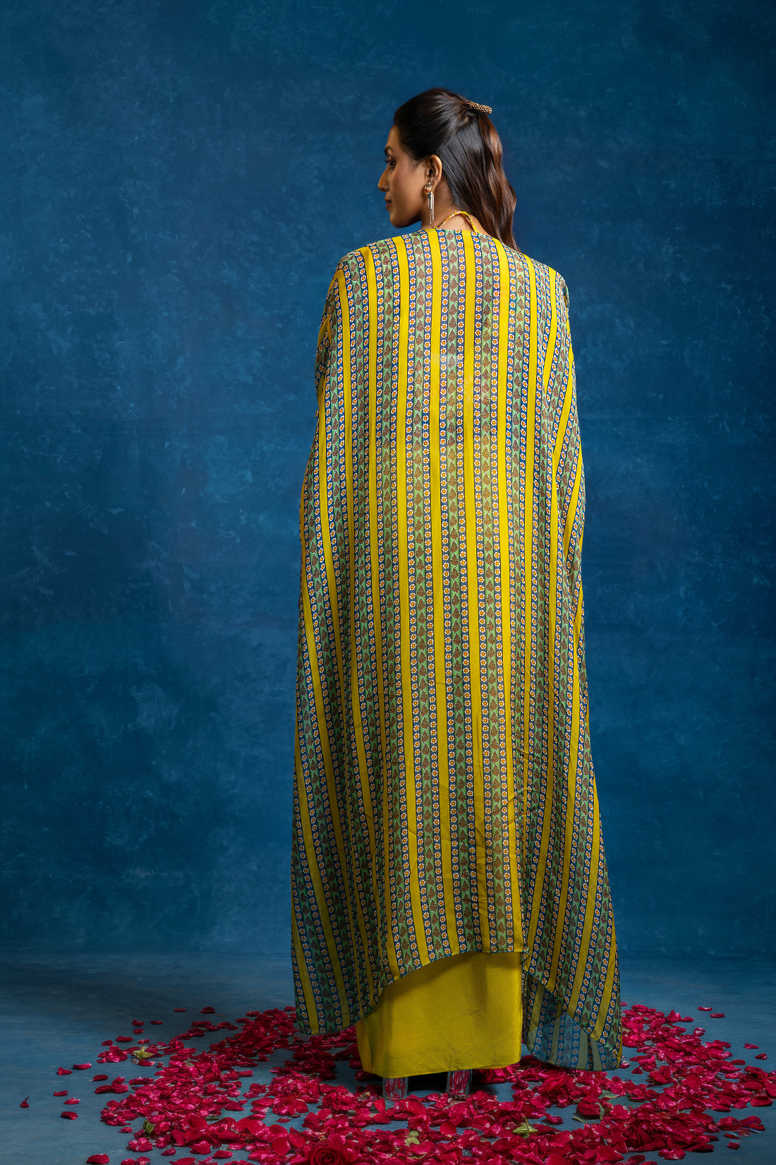 Yellow Aarani embellished v-neck bustier and drape skirt in crepe, paired with long cape in organza.