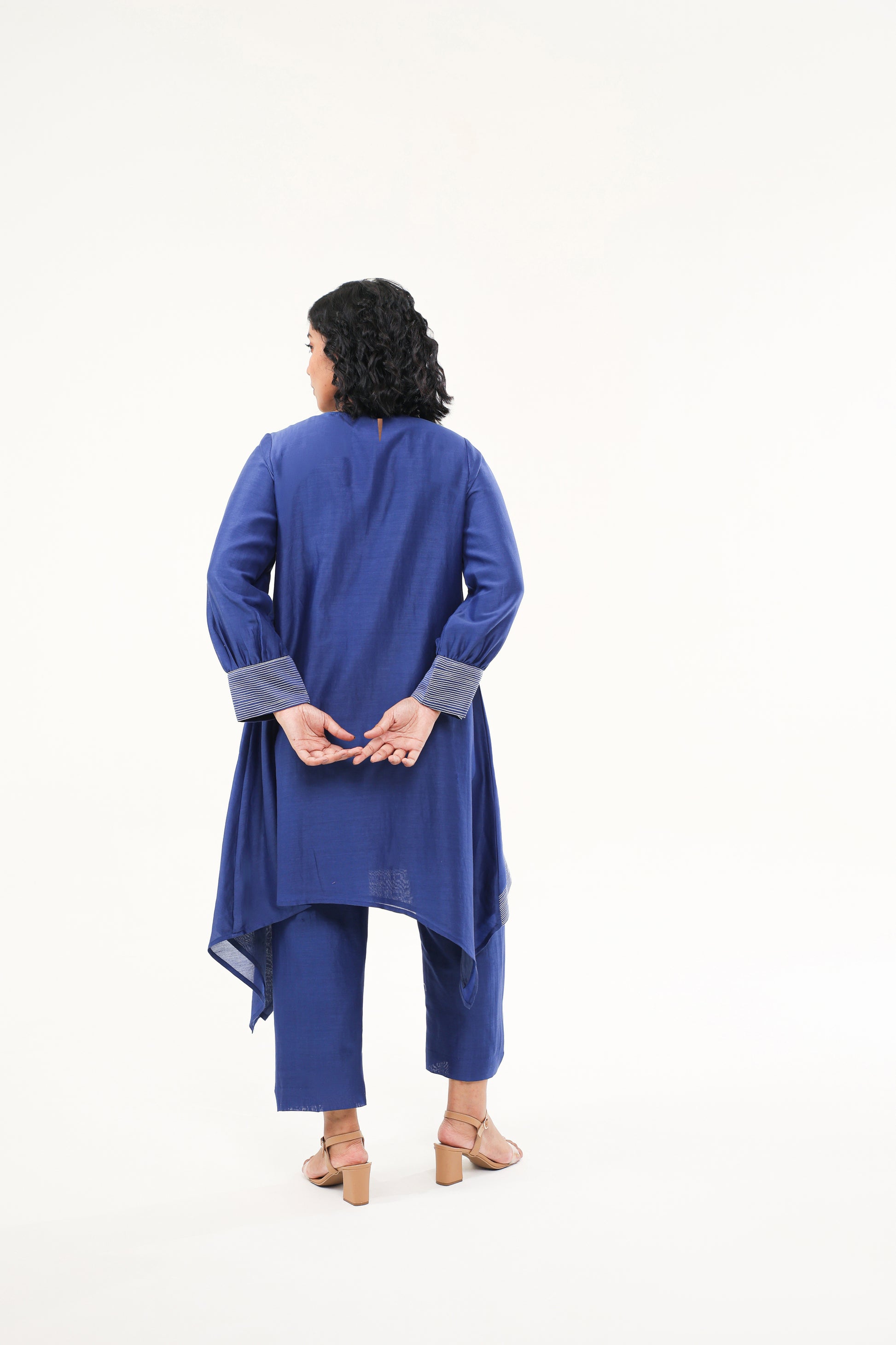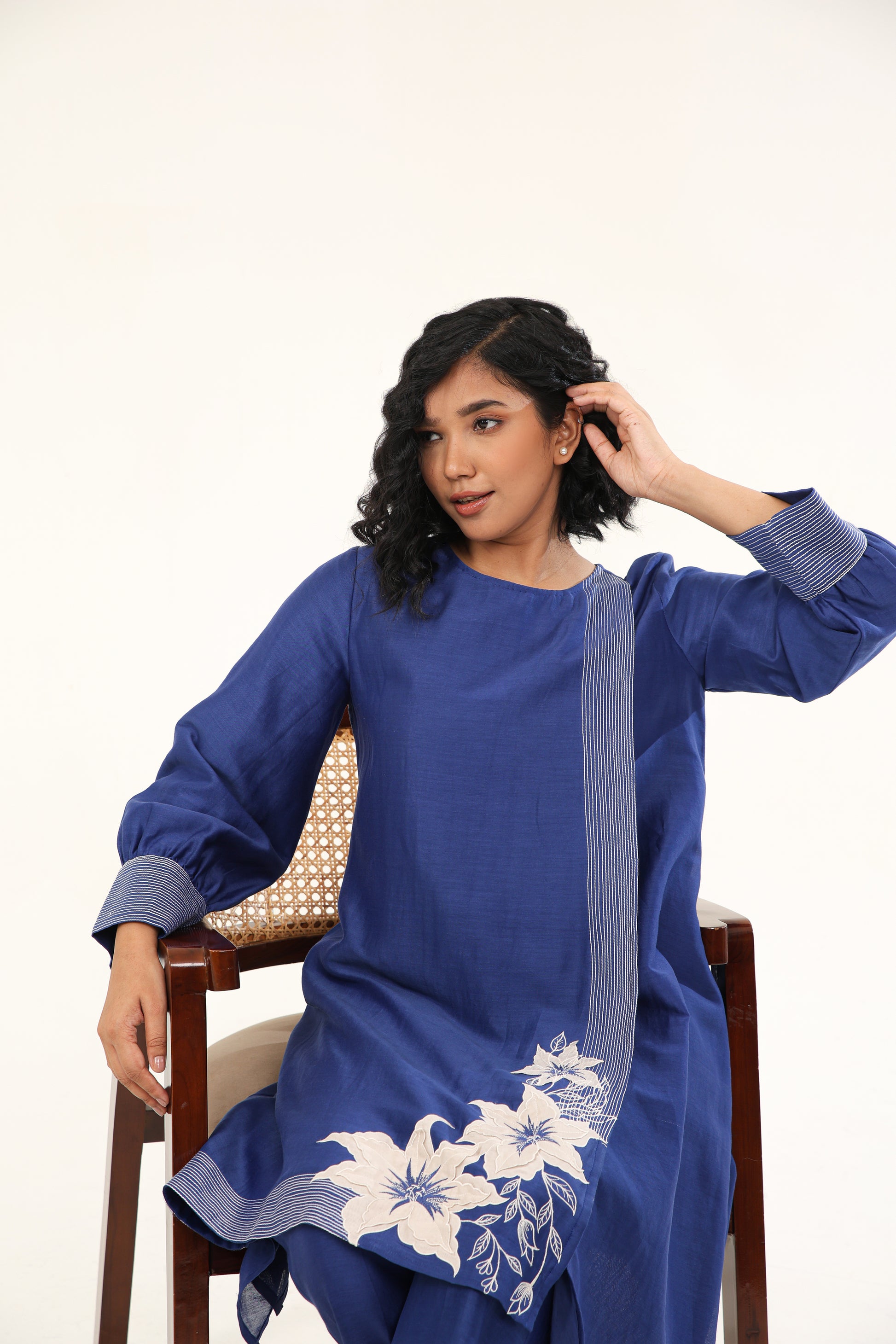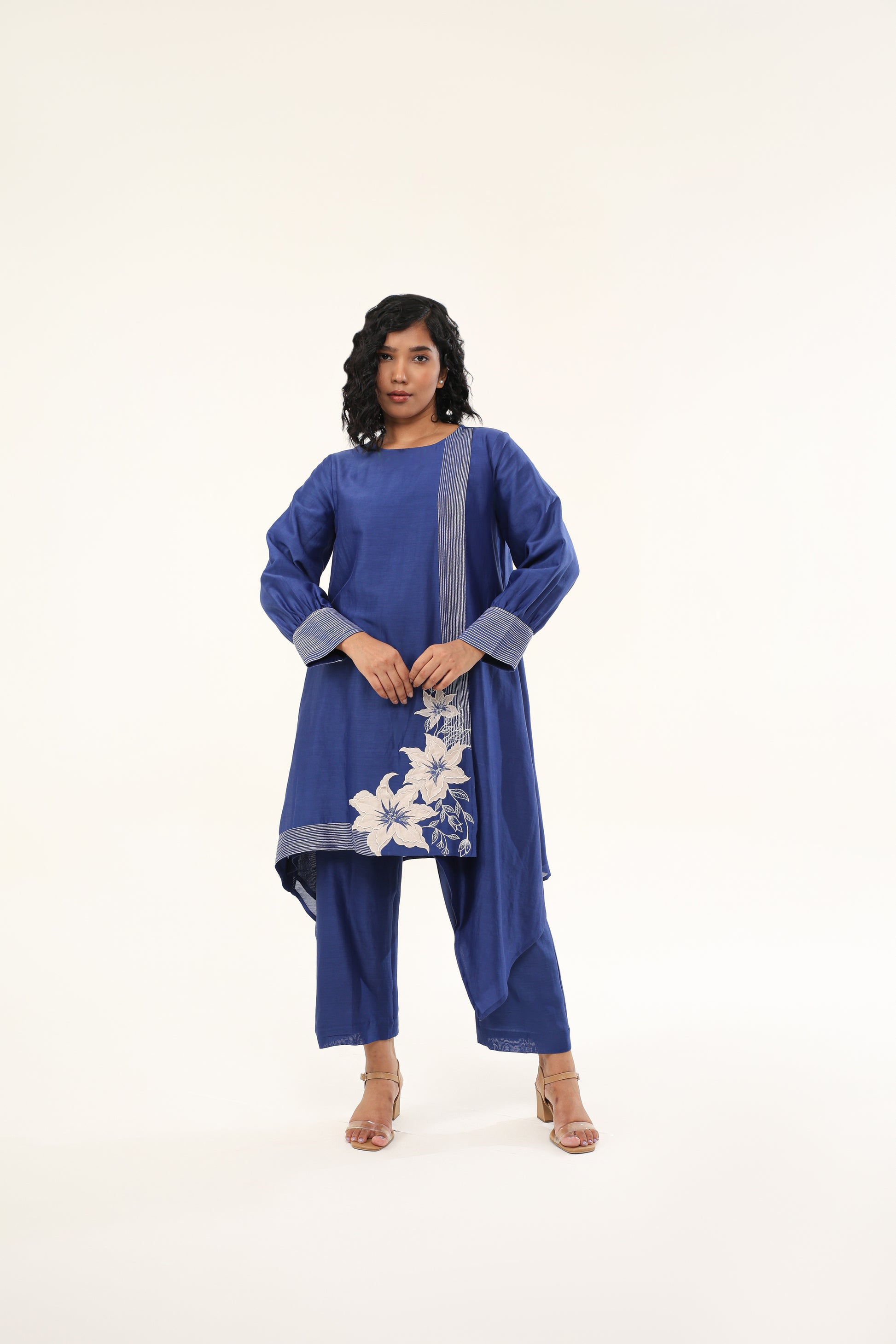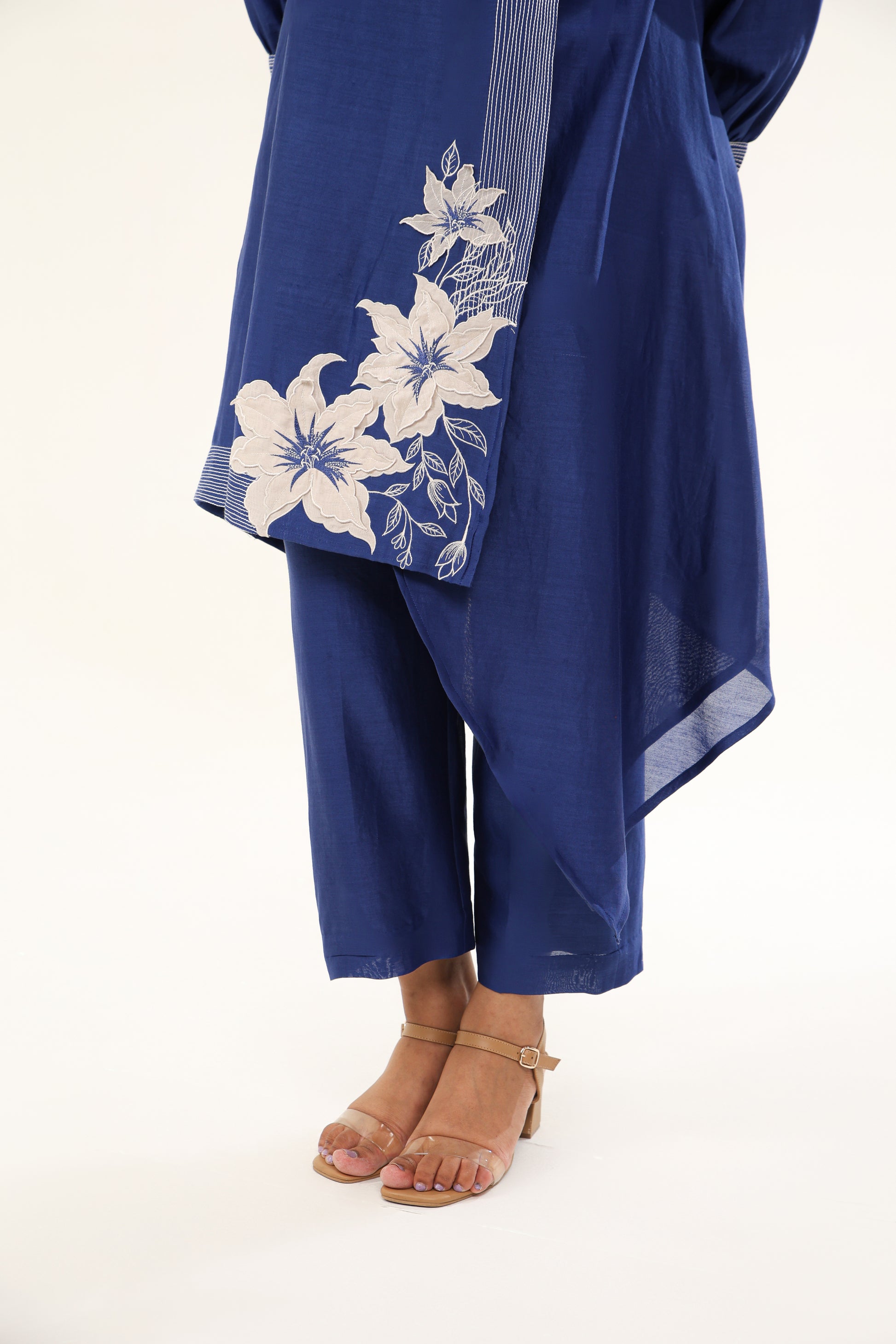This asymmetrical suit set showcases a stunning blend of straight geometric lines with delicate threadwork and appliqué, beautifully merging structure with floral motifs. Paired with matching pants, it is perfect for the modern woman who values artistic design and sustainability.