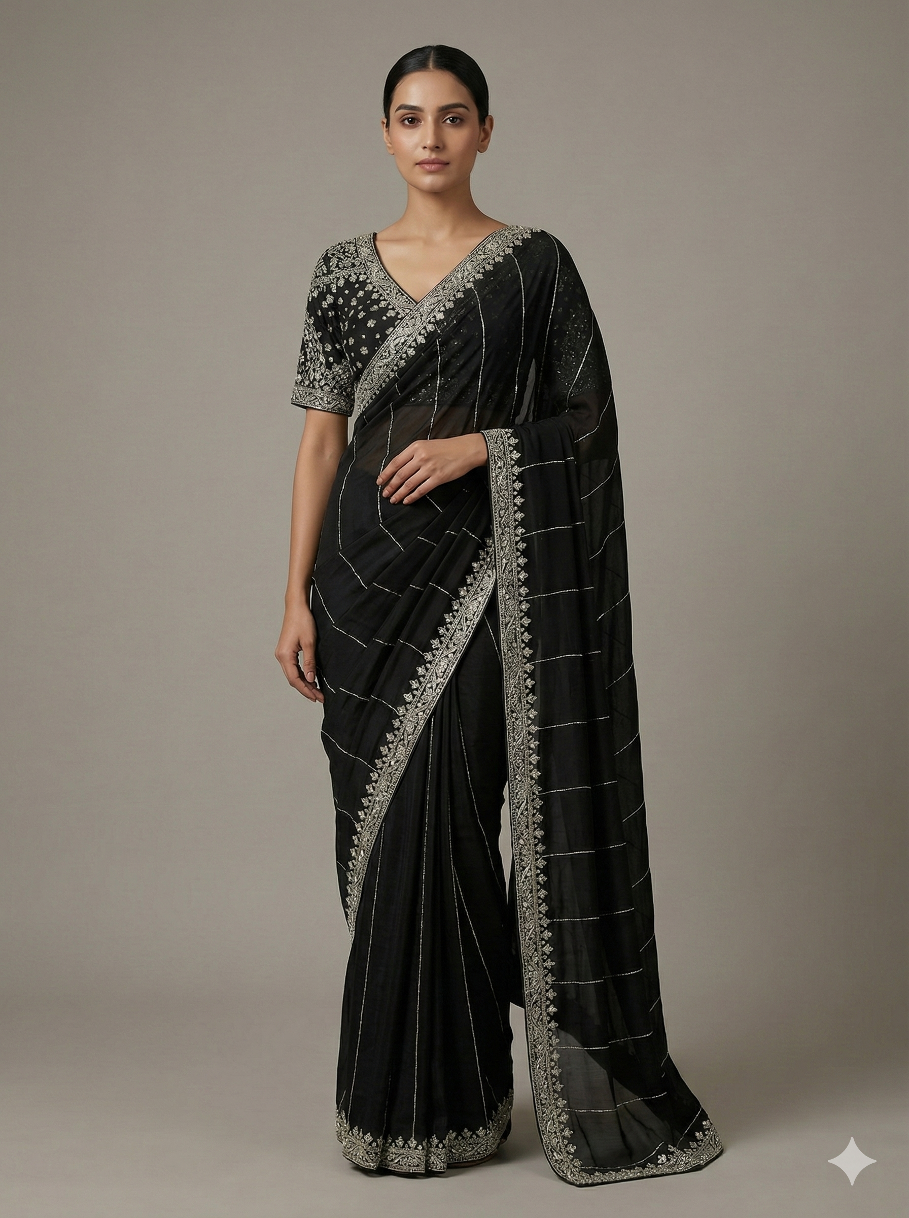 Featuring a heavy georgette black saree with a blouse emebllished with zardozi and cutdana. Saree is artistically embellished with cutdana lines.