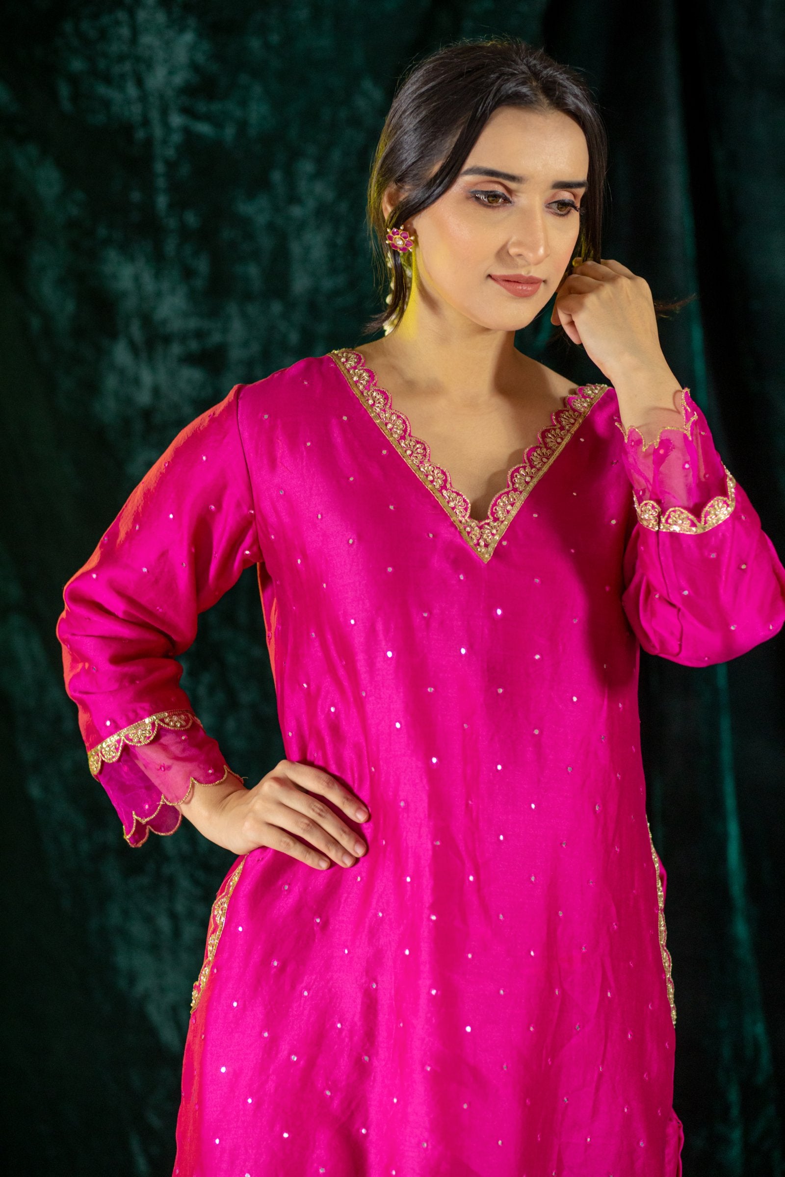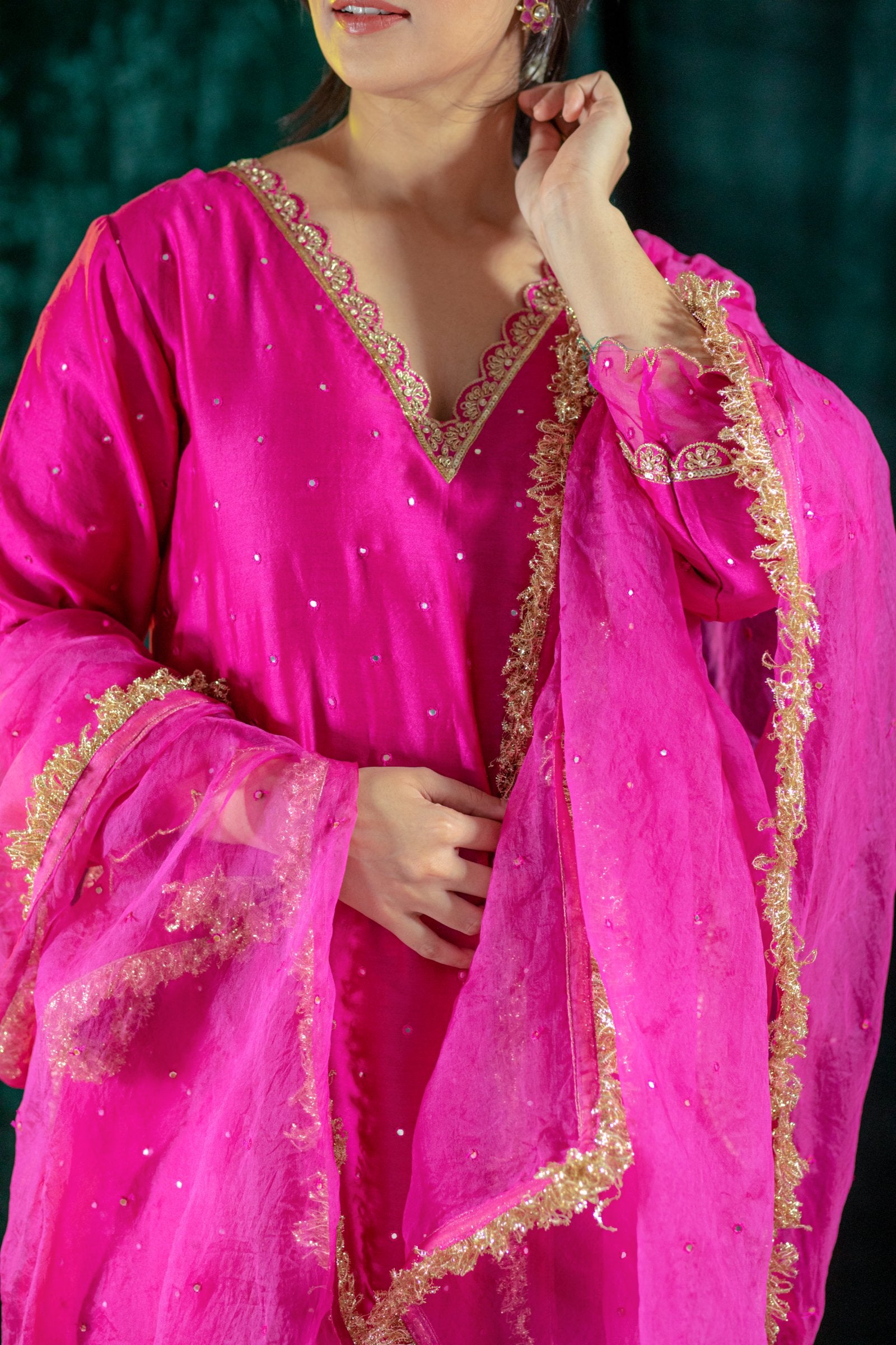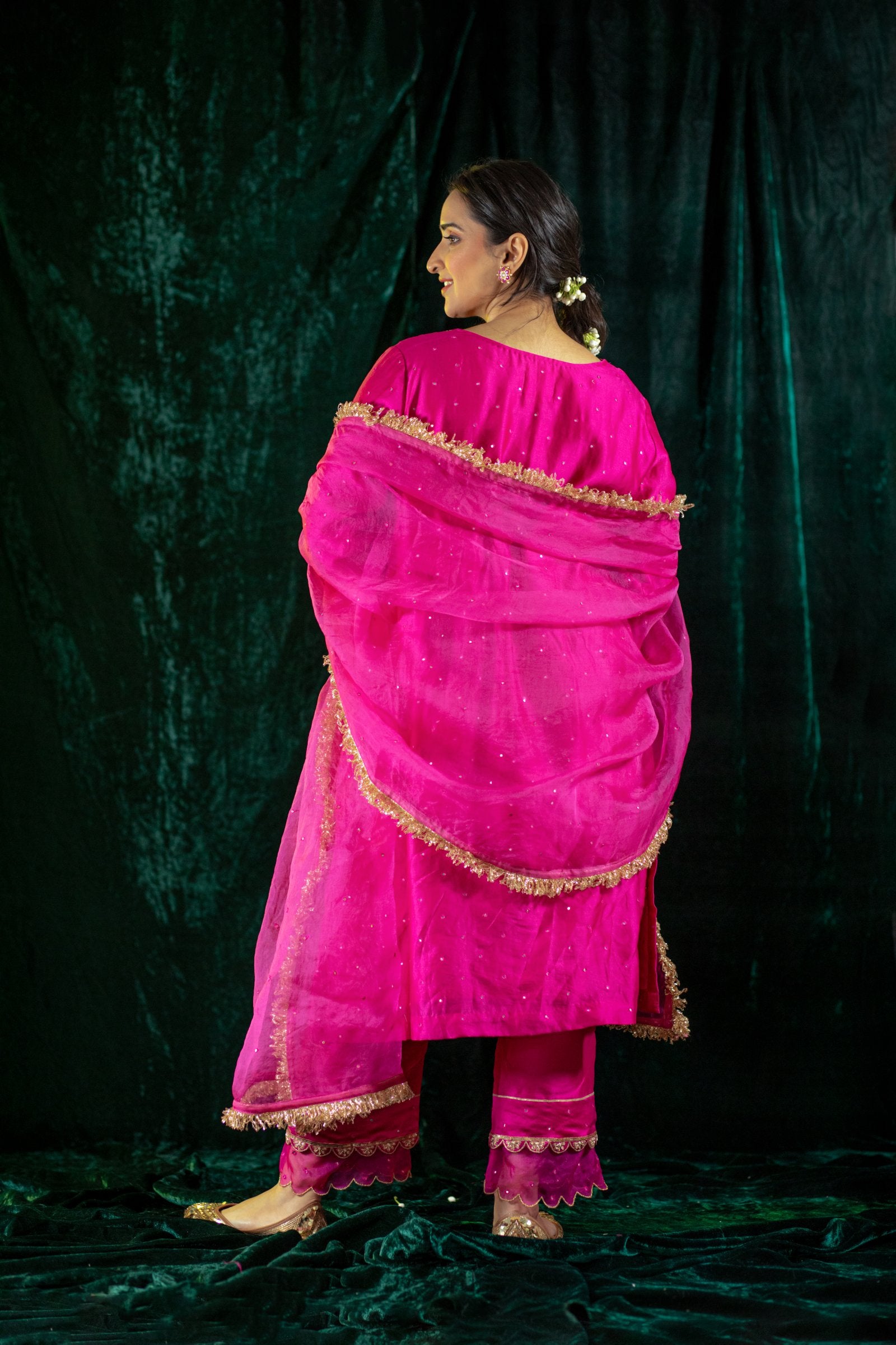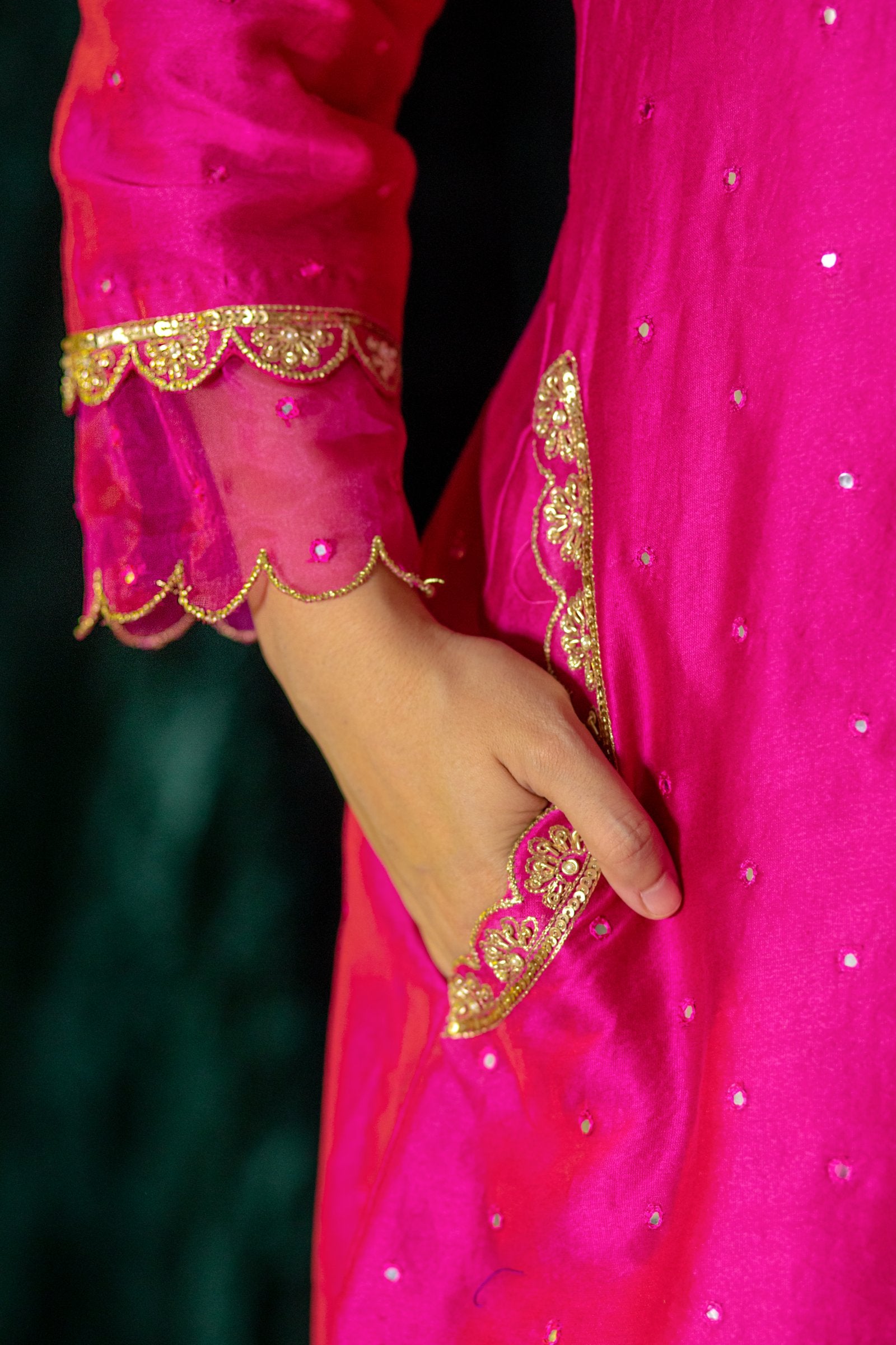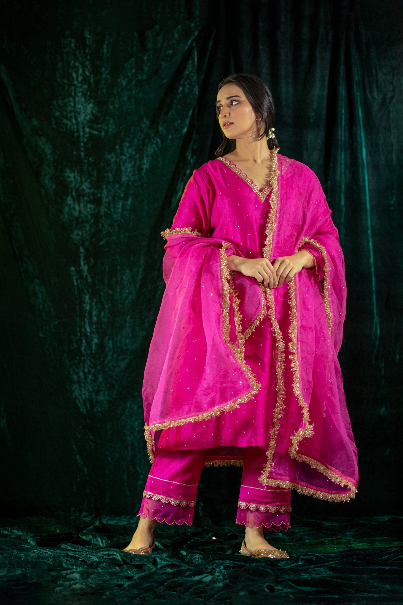 Featuring a chanderi silk set with delicate pitta, gota and sequin work on neckline and sleeves with organza cutwork. Pockets are also highlighted with the same embroidery. It comes along with a matching chanderi silk trouser with gota and sequin embroidery and organza cutwork. The dupatta is set in organza with delicate embroidery motifs and a dramatic gota border. |