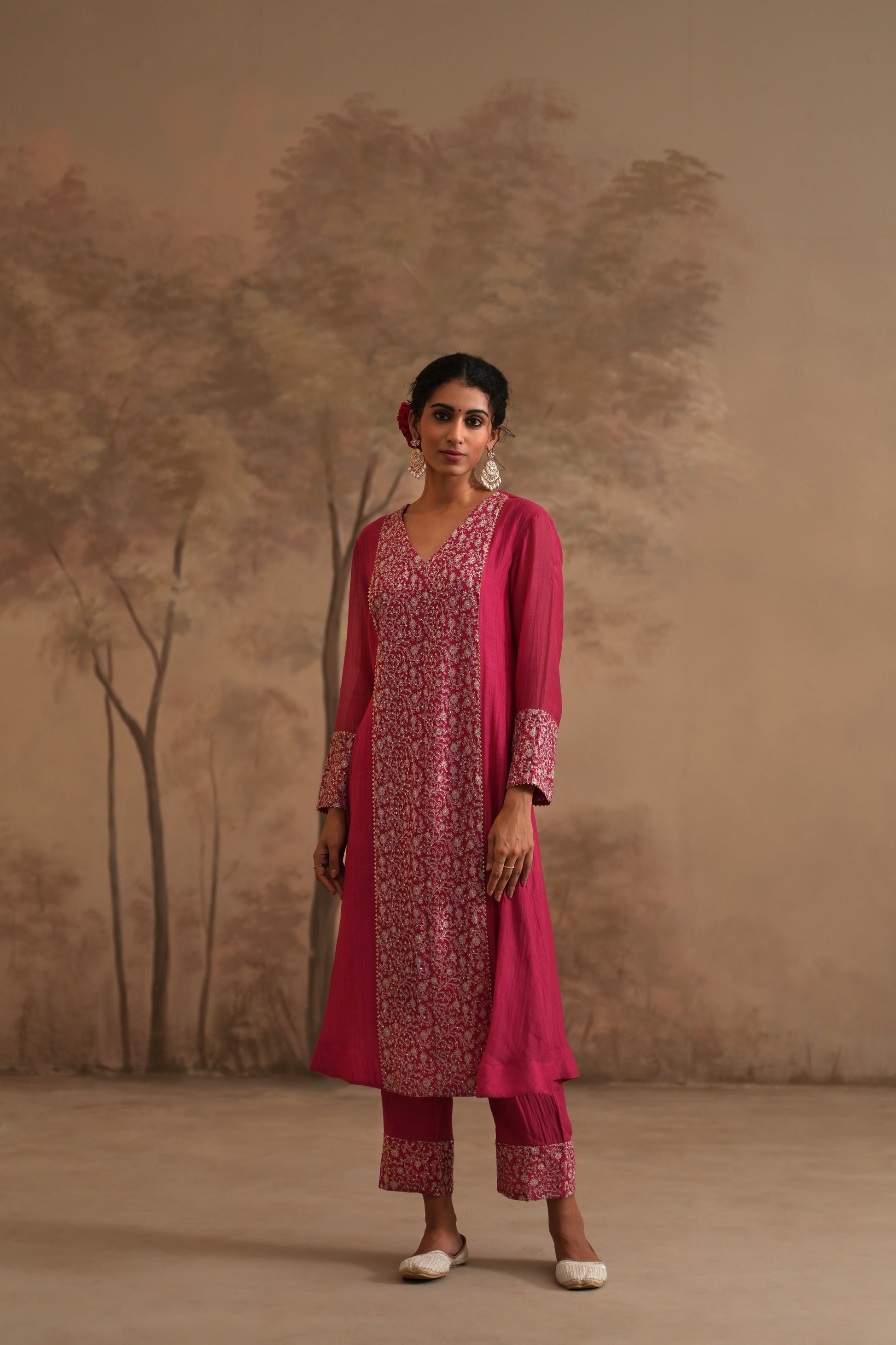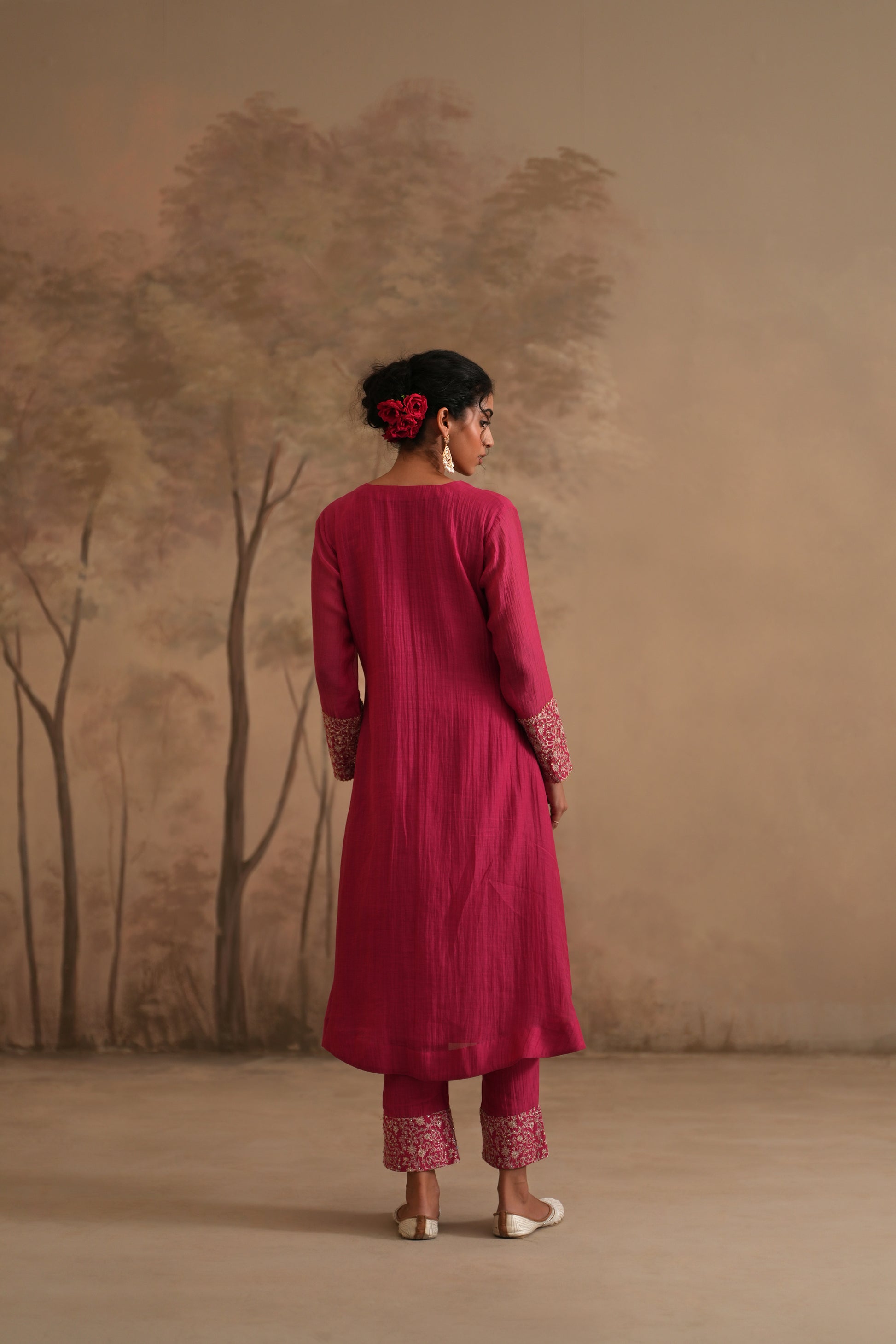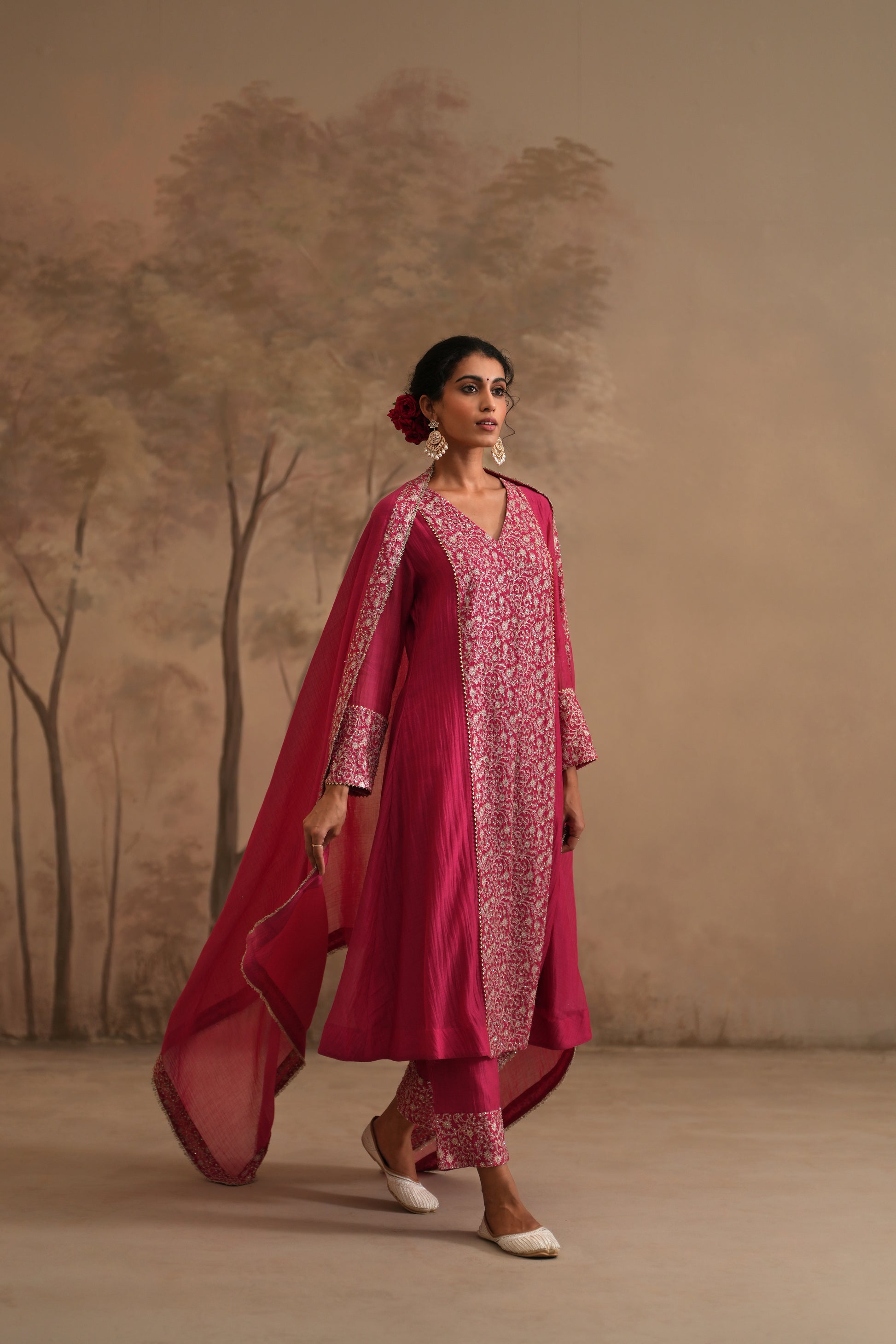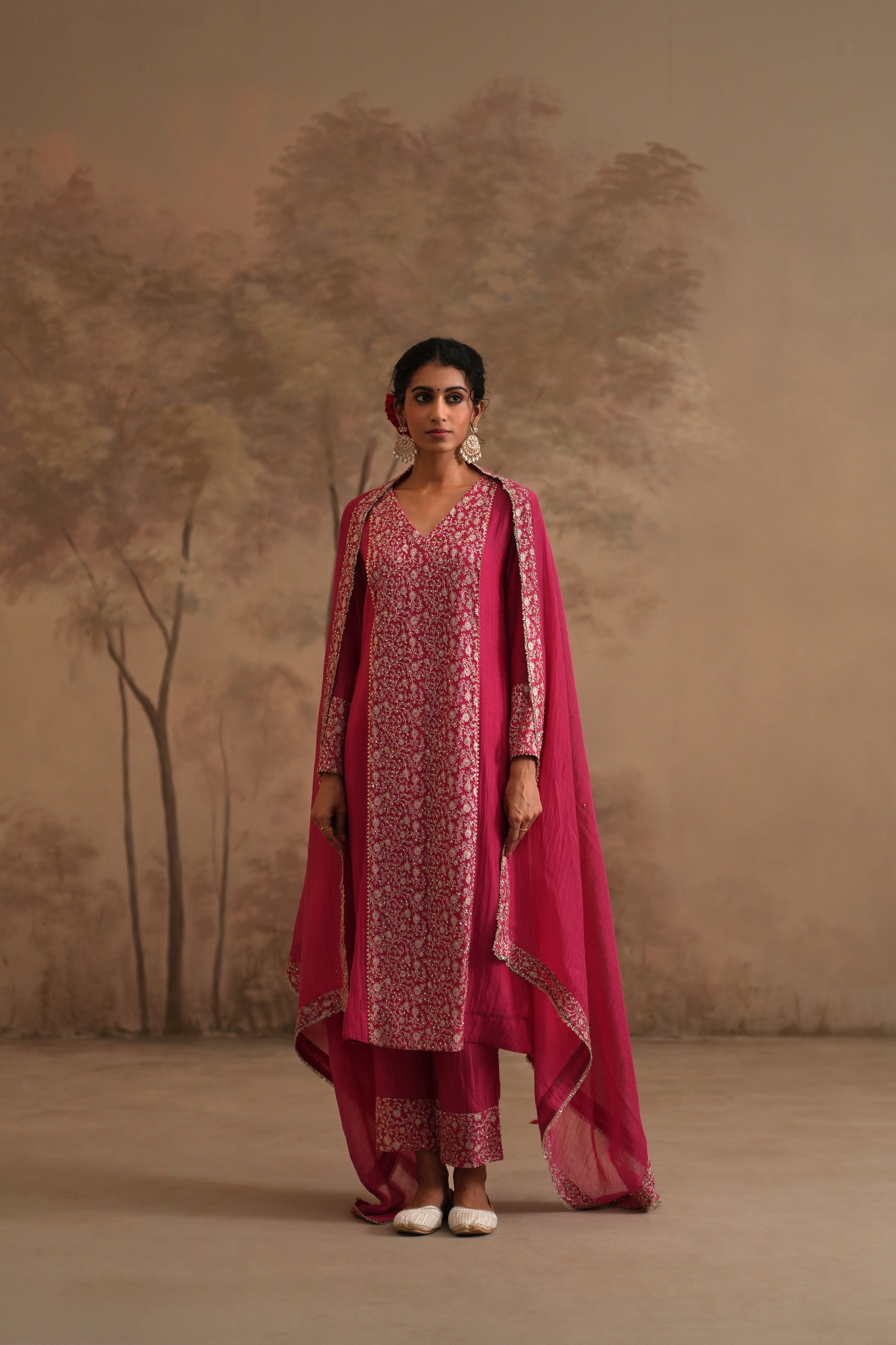 Handwoven Chanderi kurta Set in fuschia pink with heavy dupatta. Kurta, Pants and dupatta are intricately embellished with thread zari work and crystal detailing.