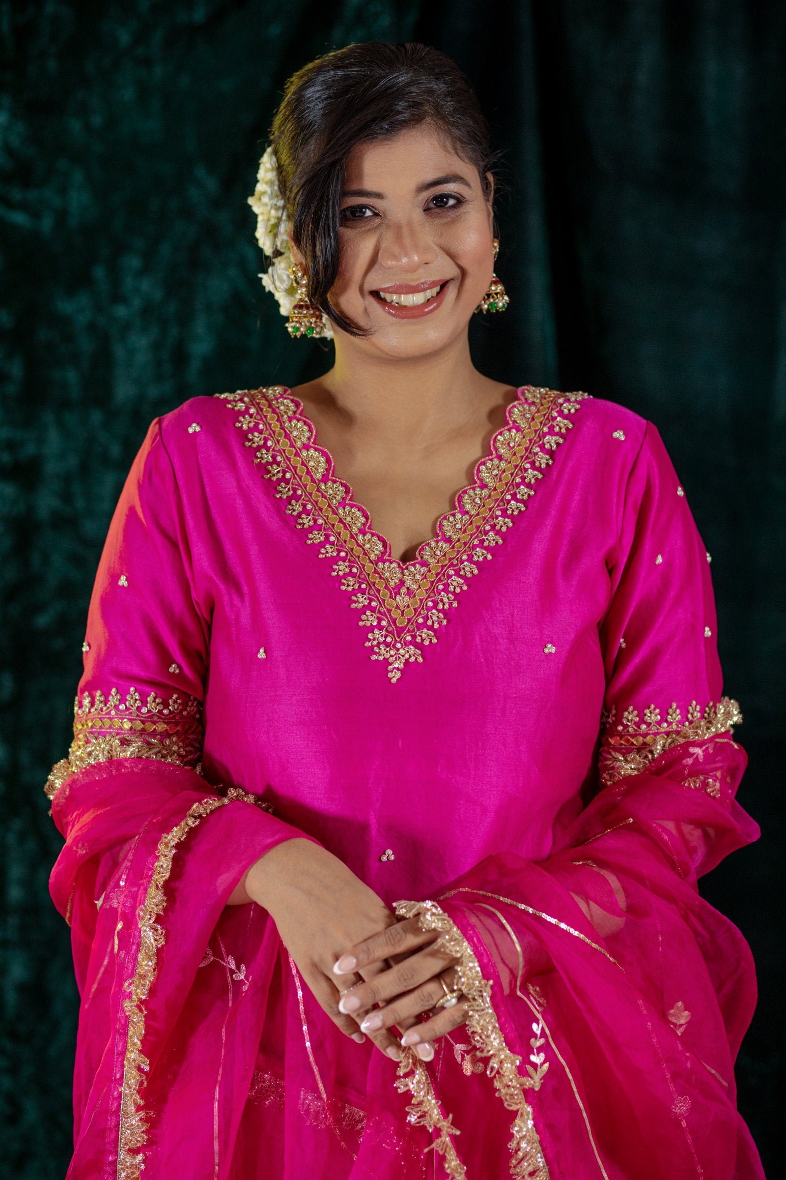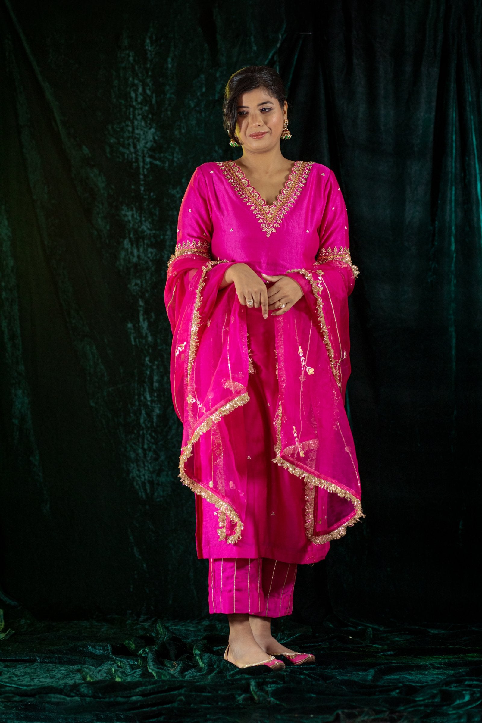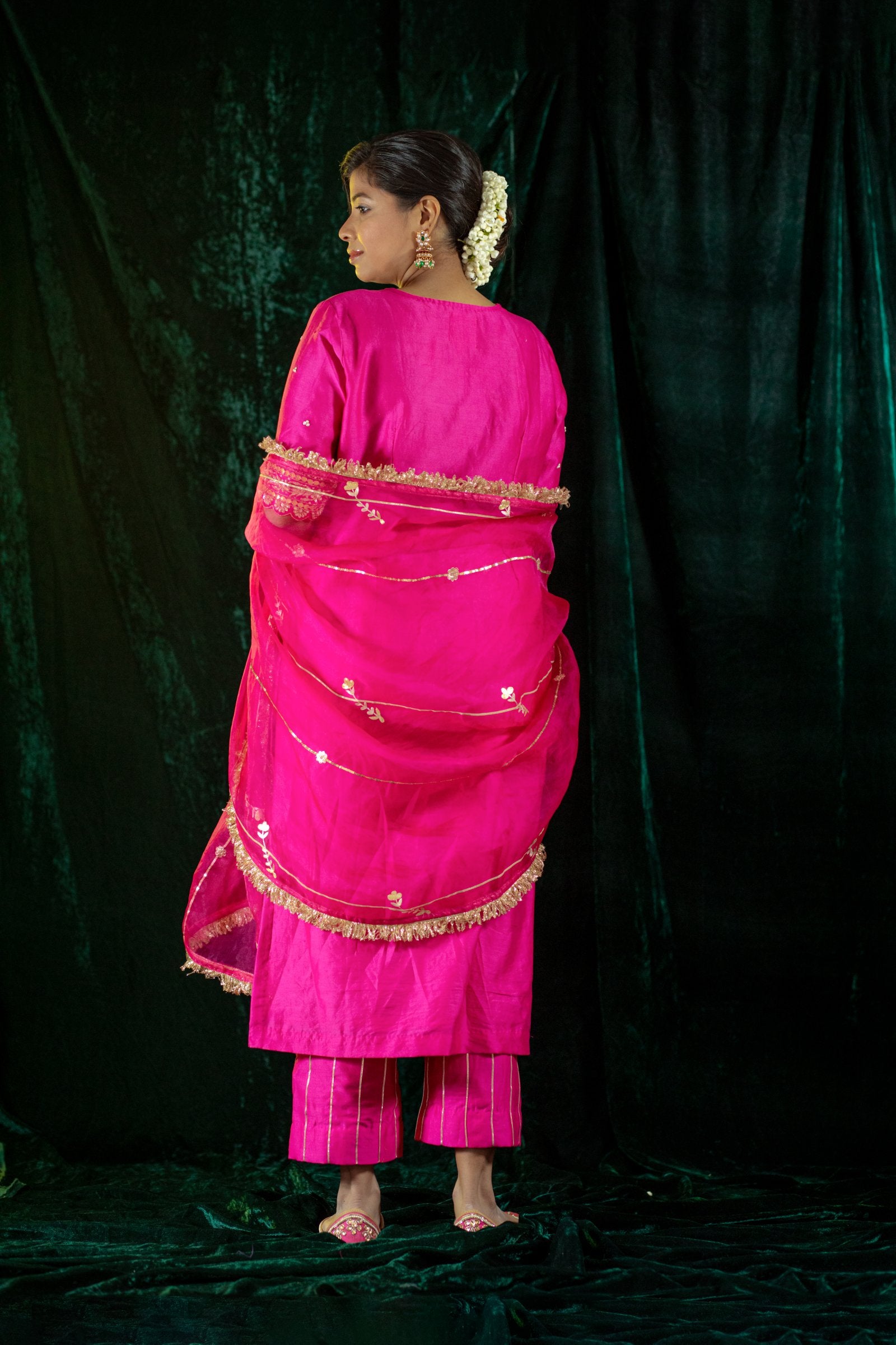 Featuring a chanderi silk kurta set with delicate gotta patti handwork highlighted with pearls on neckline and sleeves. Comes with straight Chanderi silk pants highlighted with gotta patti lines. This Set comes with organza dupatta with handcrafted motifs. |