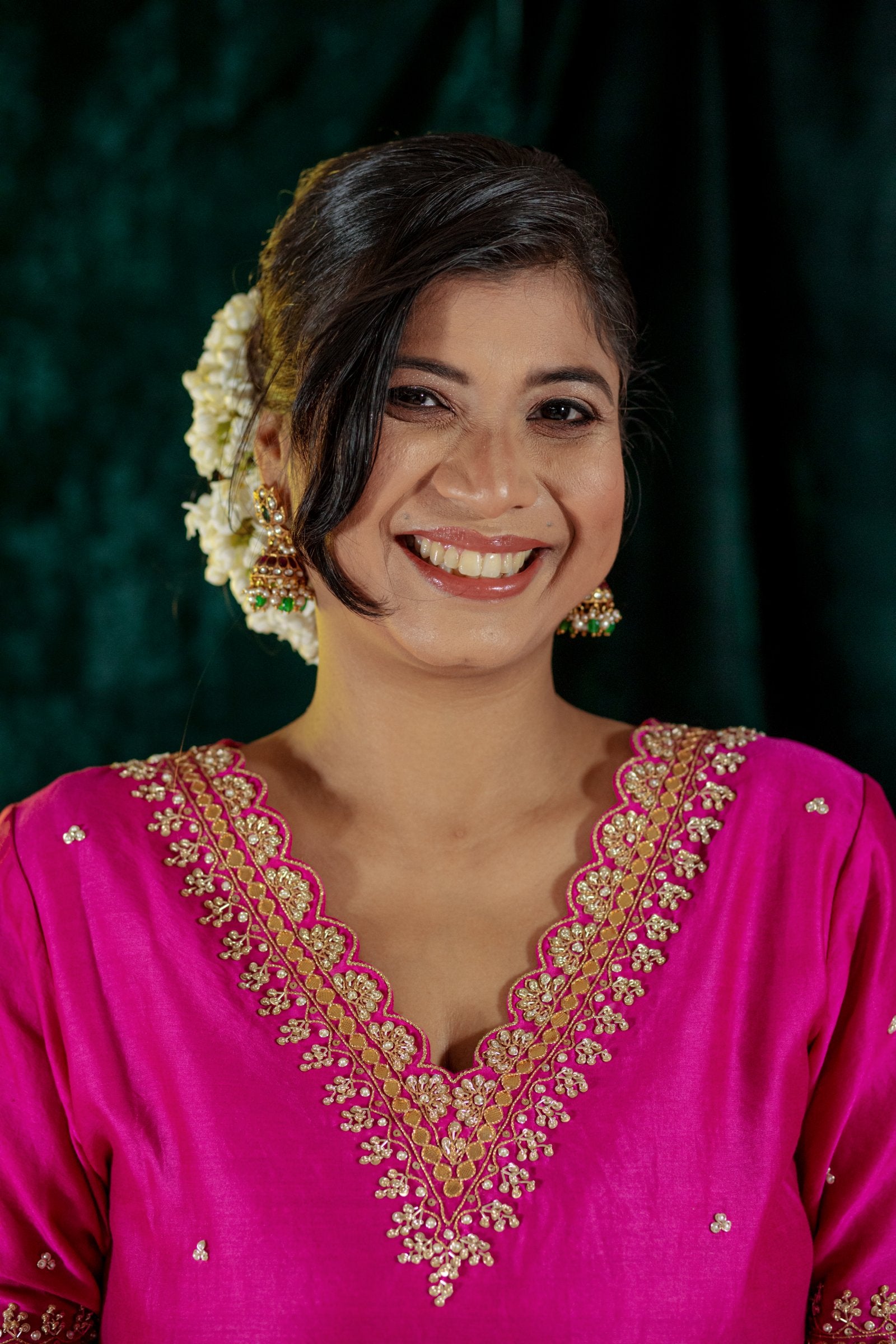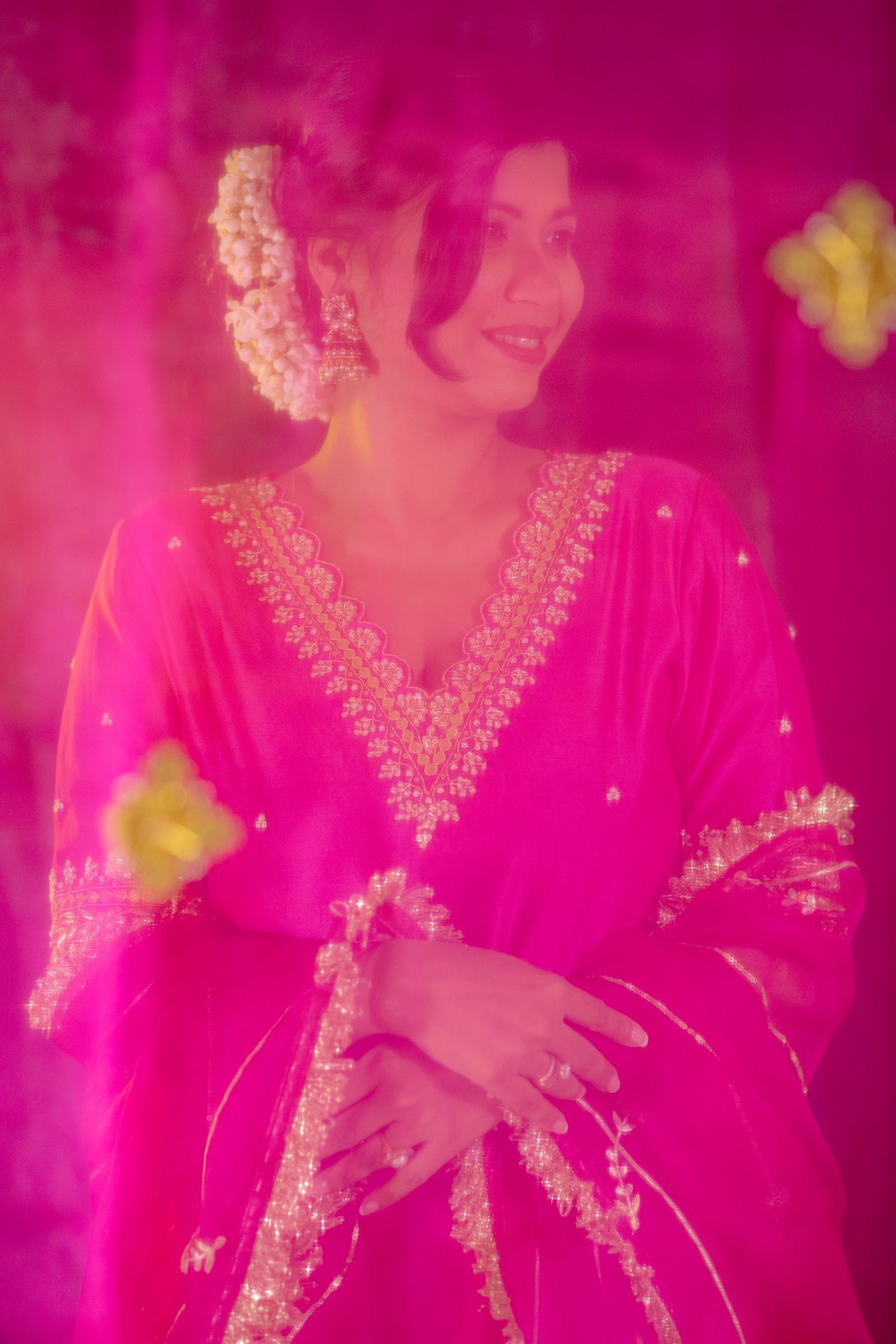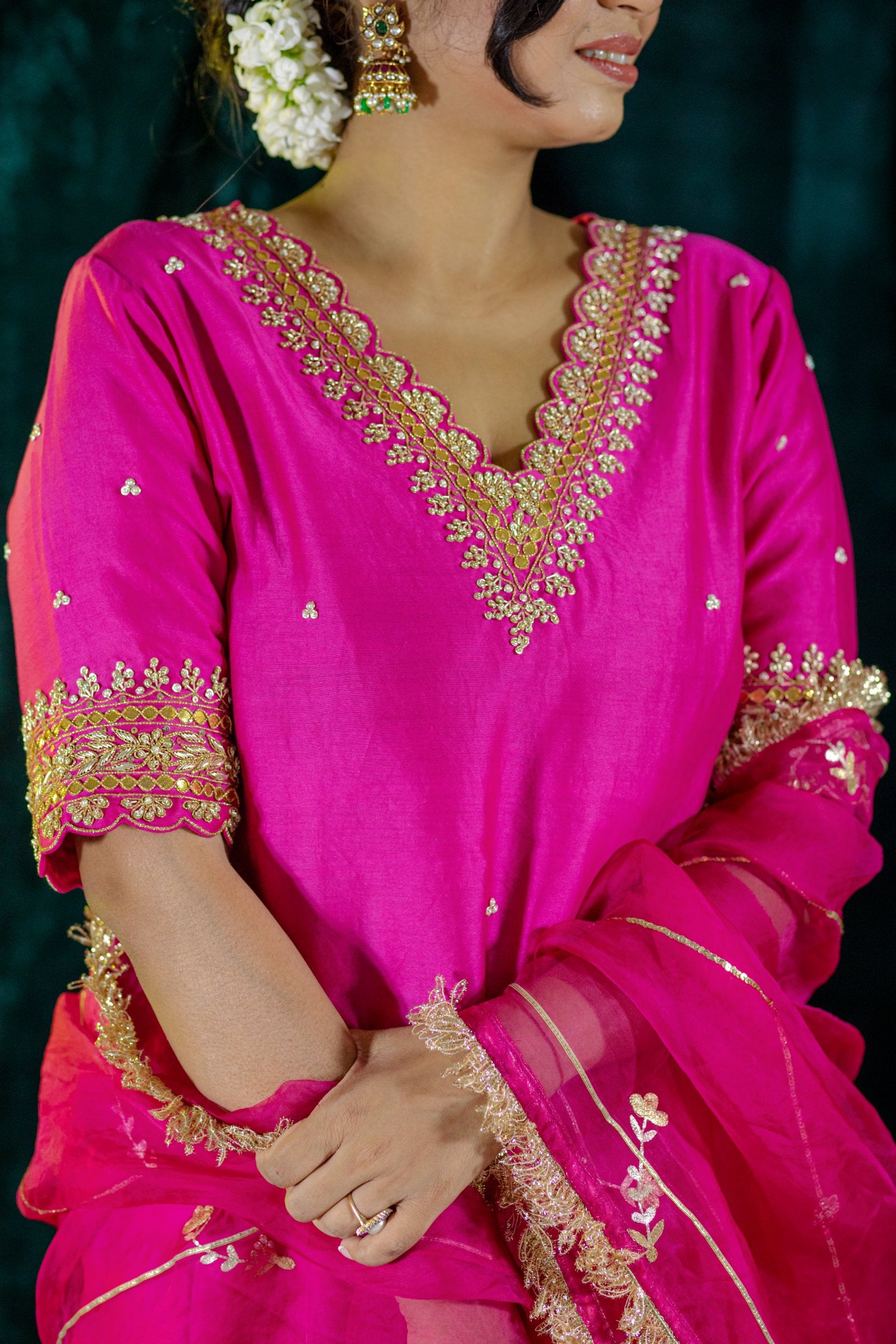 Featuring a chanderi silk kurta set with delicate gotta patti handwork highlighted with pearls on neckline and sleeves. Comes with straight Chanderi silk pants highlighted with gotta patti lines. This Set comes with organza dupatta with handcrafted motifs. |