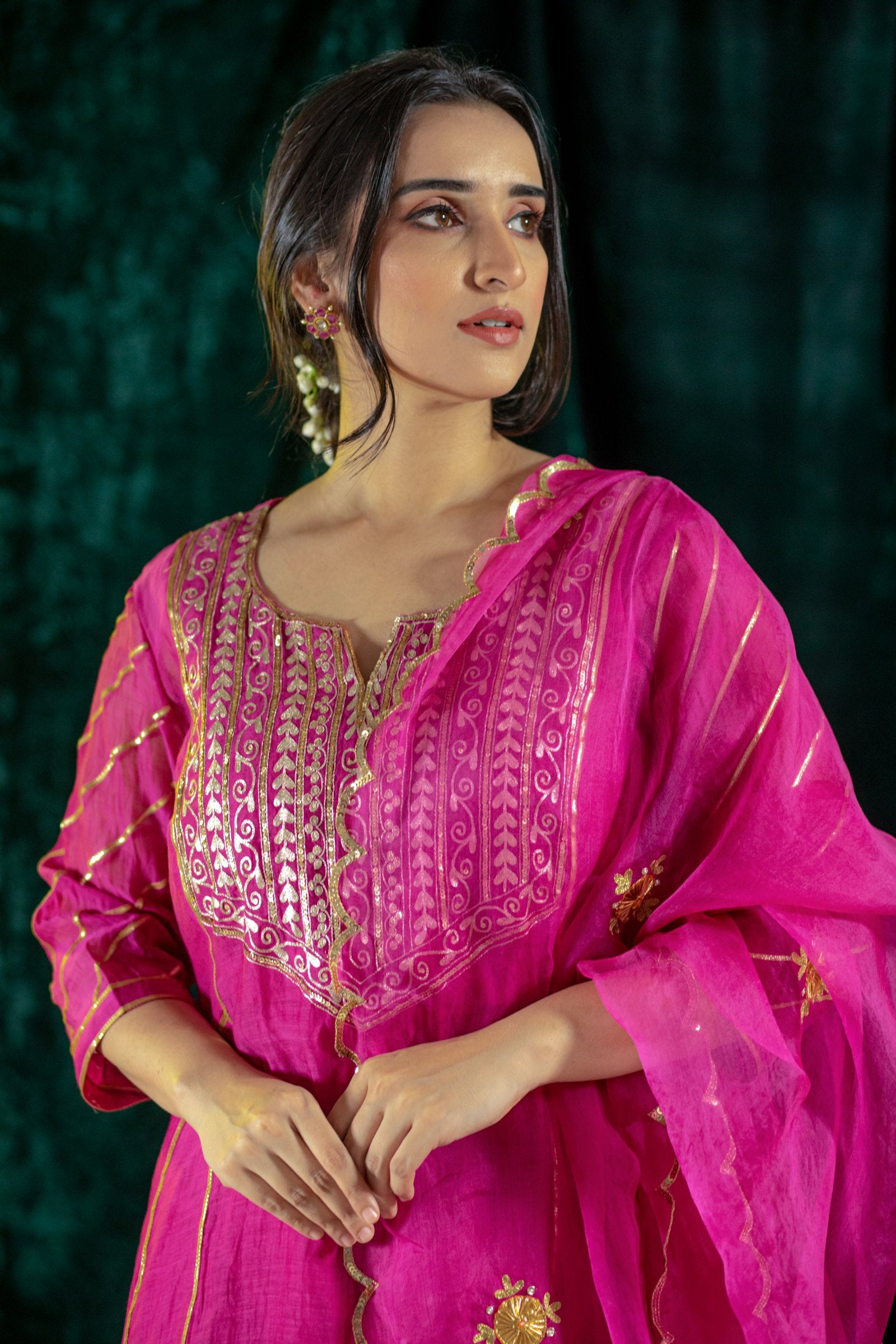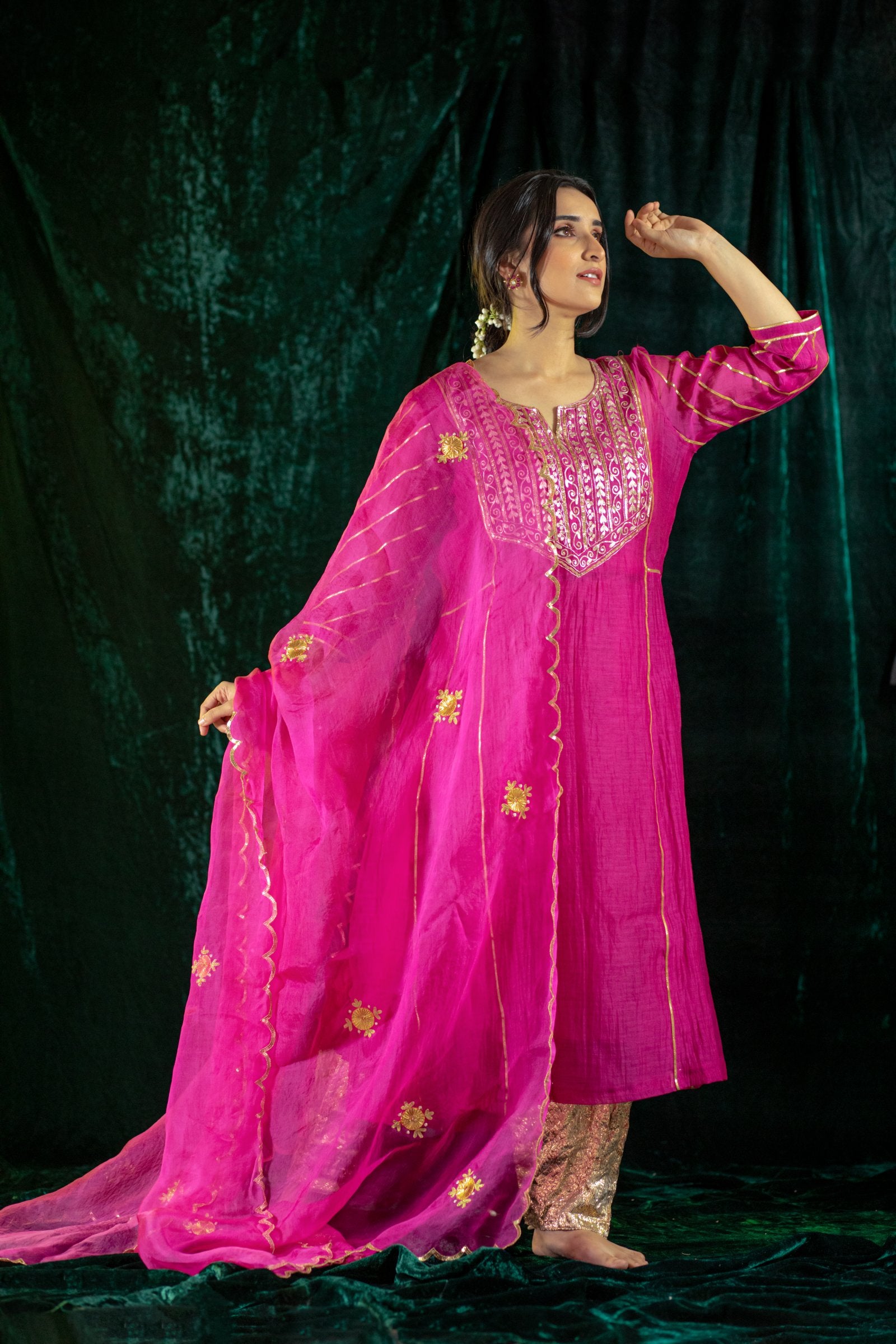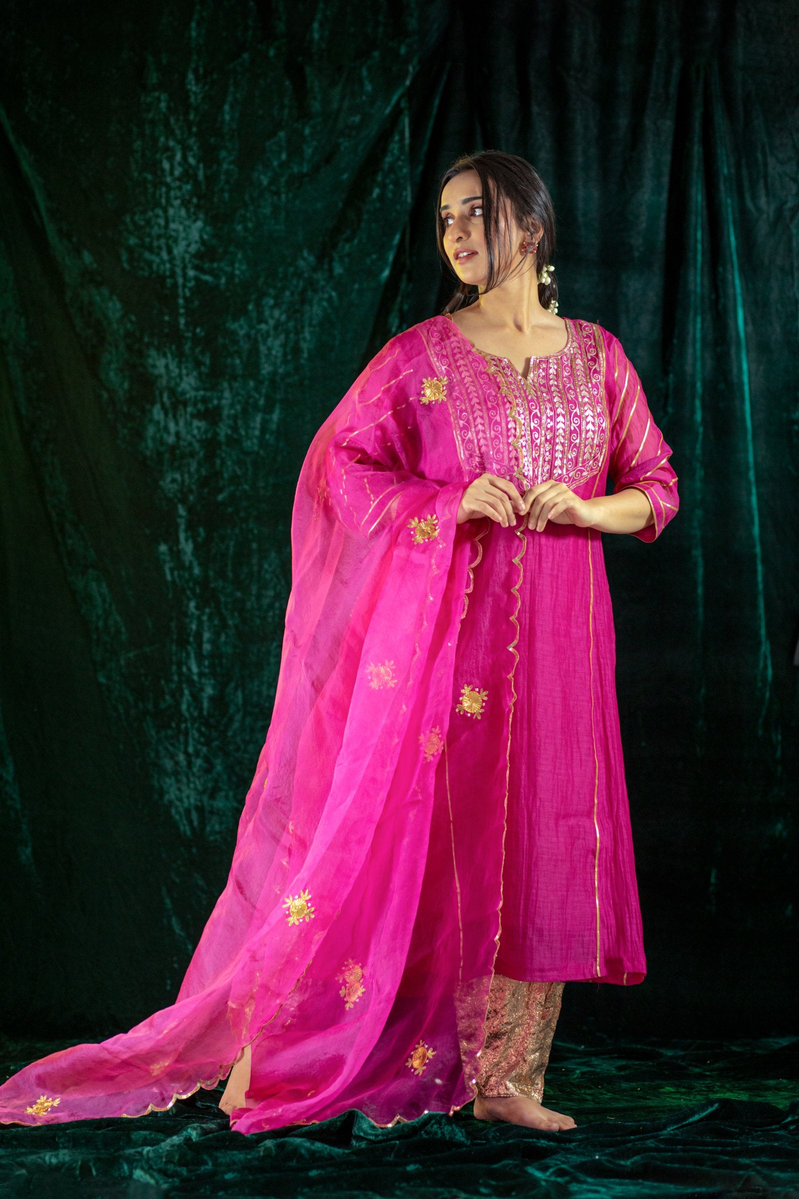 Featuring a handloom chanderi set with delicate pitta, gota and sequin work on yoke and gota lines on the shirt and sleevs. Comes with a matching salwar with a crushed gota pauncha and a matching organza dupatta with gota motifs and border. |