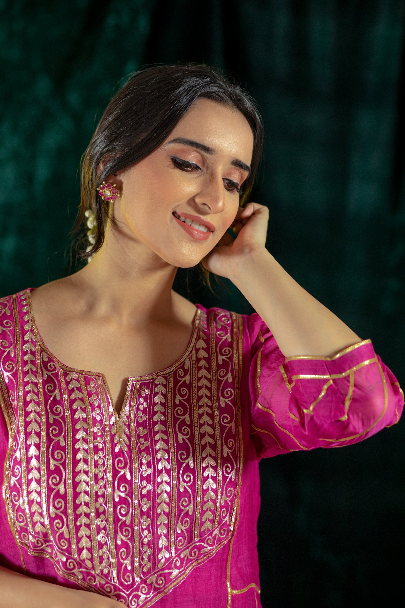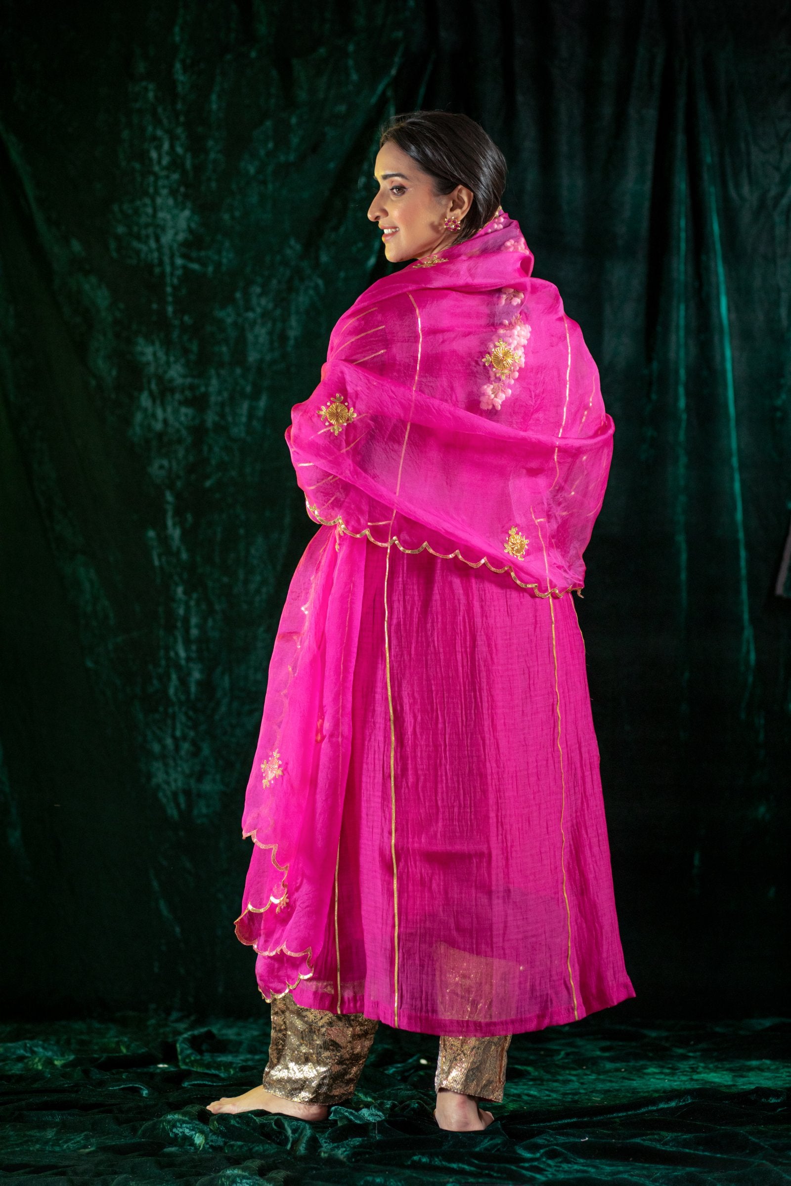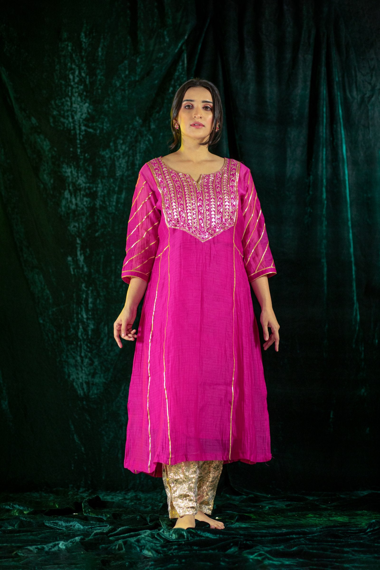 Featuring a handloom chanderi set with delicate pitta, gota and sequin work on yoke and gota lines on the shirt and sleevs. Comes with a matching salwar with a crushed gota pauncha and a matching organza dupatta with gota motifs and border. |