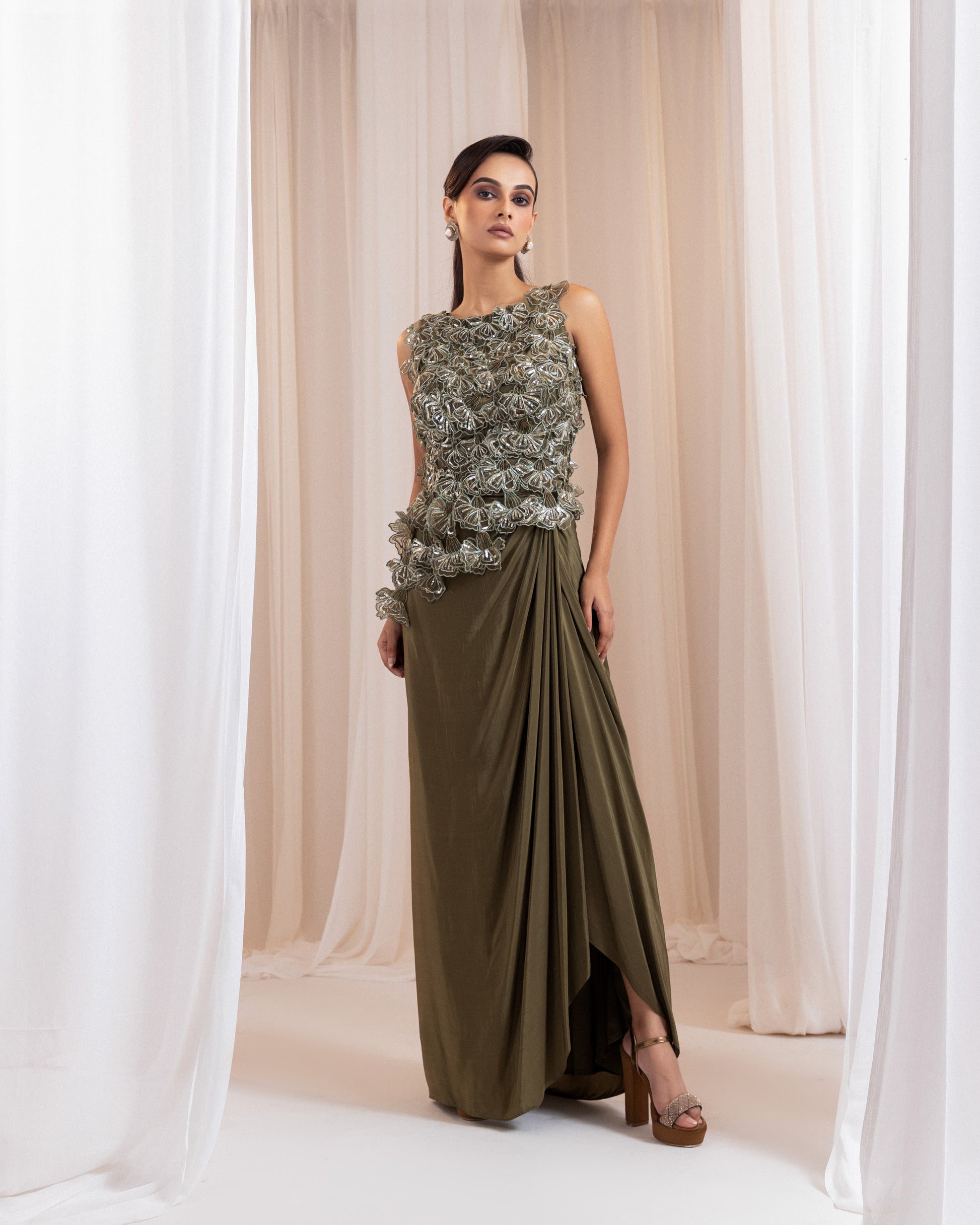 A two-piece set in deep olive green, featuring a top adorned with 3D floral work and asymmetrical organza buttas, richly embroidered in metallic gold and silver. The knot-drape skirt adds depth and texture with a sculpted finish. A soft sheen runs through the fabric, enhancing its after-dark elegance. Perfect for dinners, cocktail hours, and intimate festive moments.