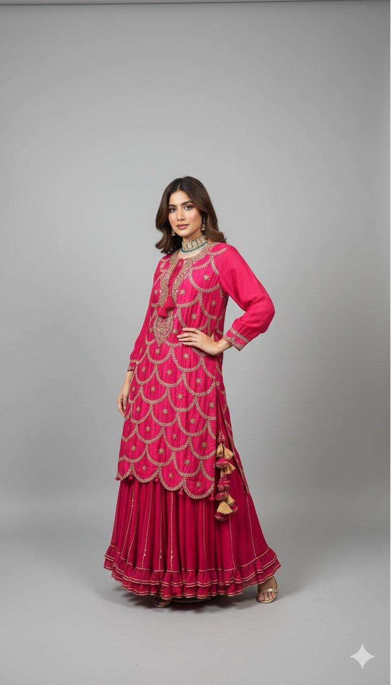 Featuring a classic gota pati sharara set with embroidery all over in scallop patterns. Kurta is in silk and sharara is georgette. It comes along with a havy bandhani dupatta also scalloped generously with gota patti along the border.