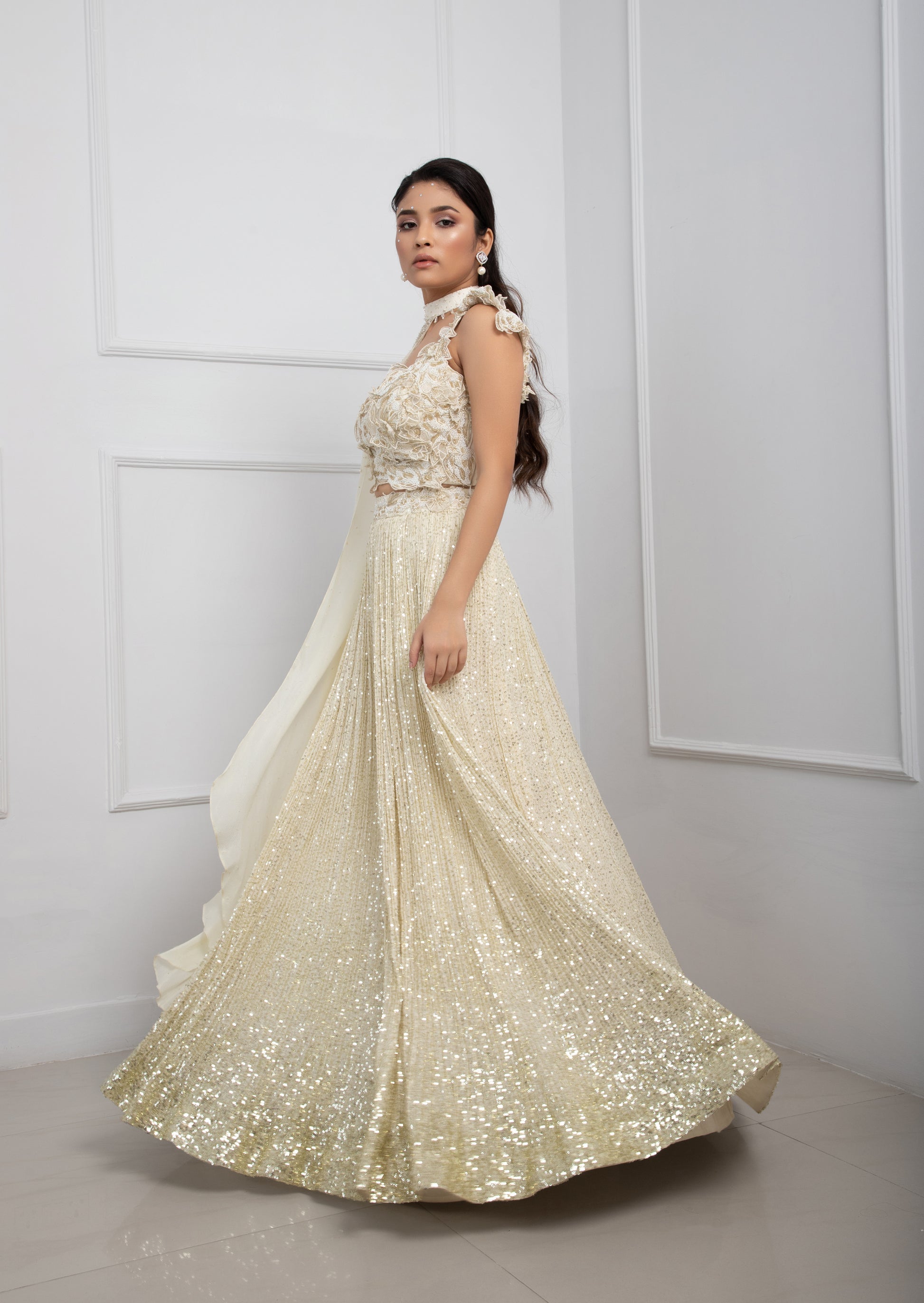 This set consists of a gathered skirt featuring gold sequins progressing from light to dense embroidery, paired with a 3D floral embroidered blouse adorned with gold detailing, and a choker neck cape sleeve