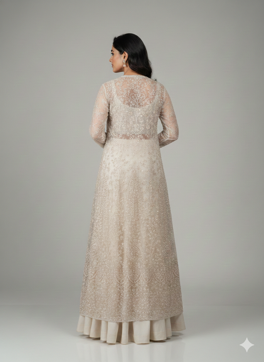 Ivory Silk Organza Long Heavy Jacket Lehenga Set