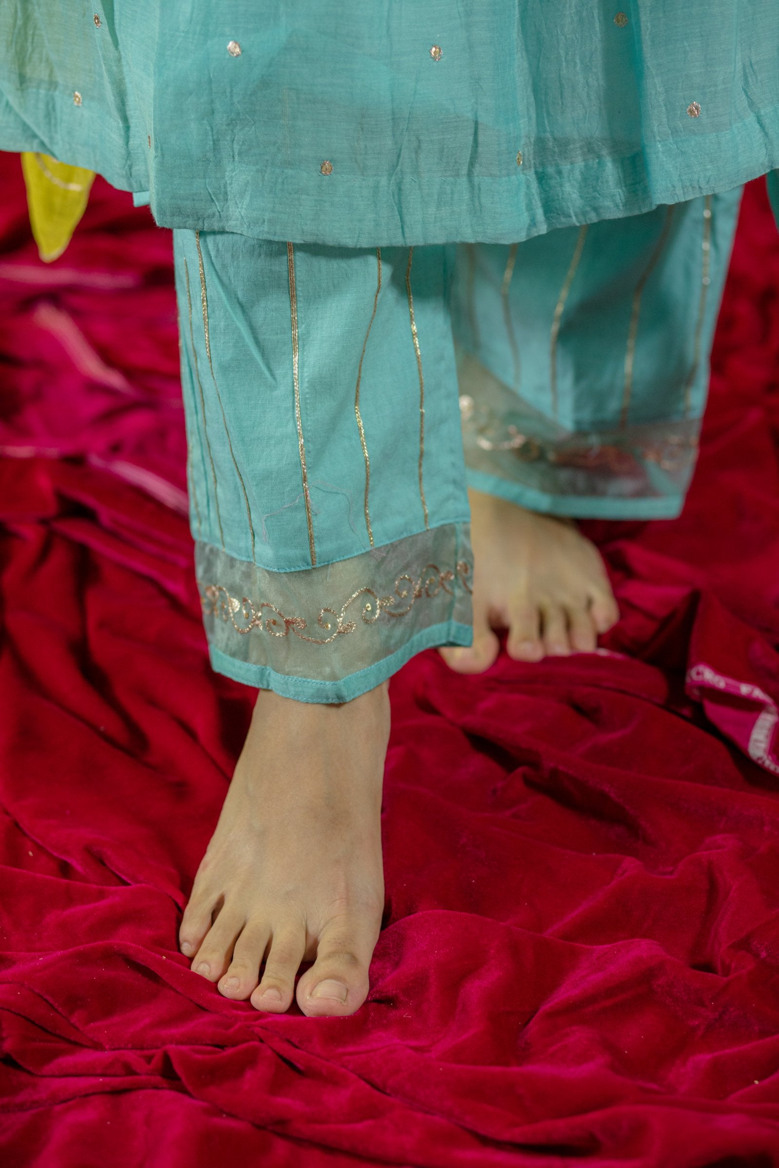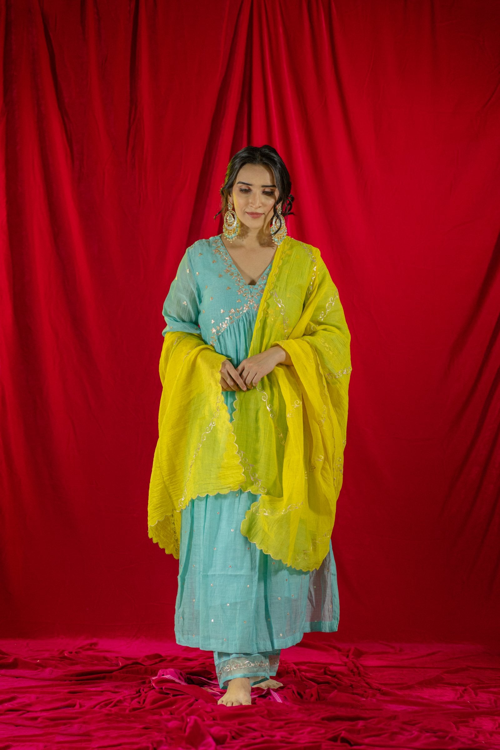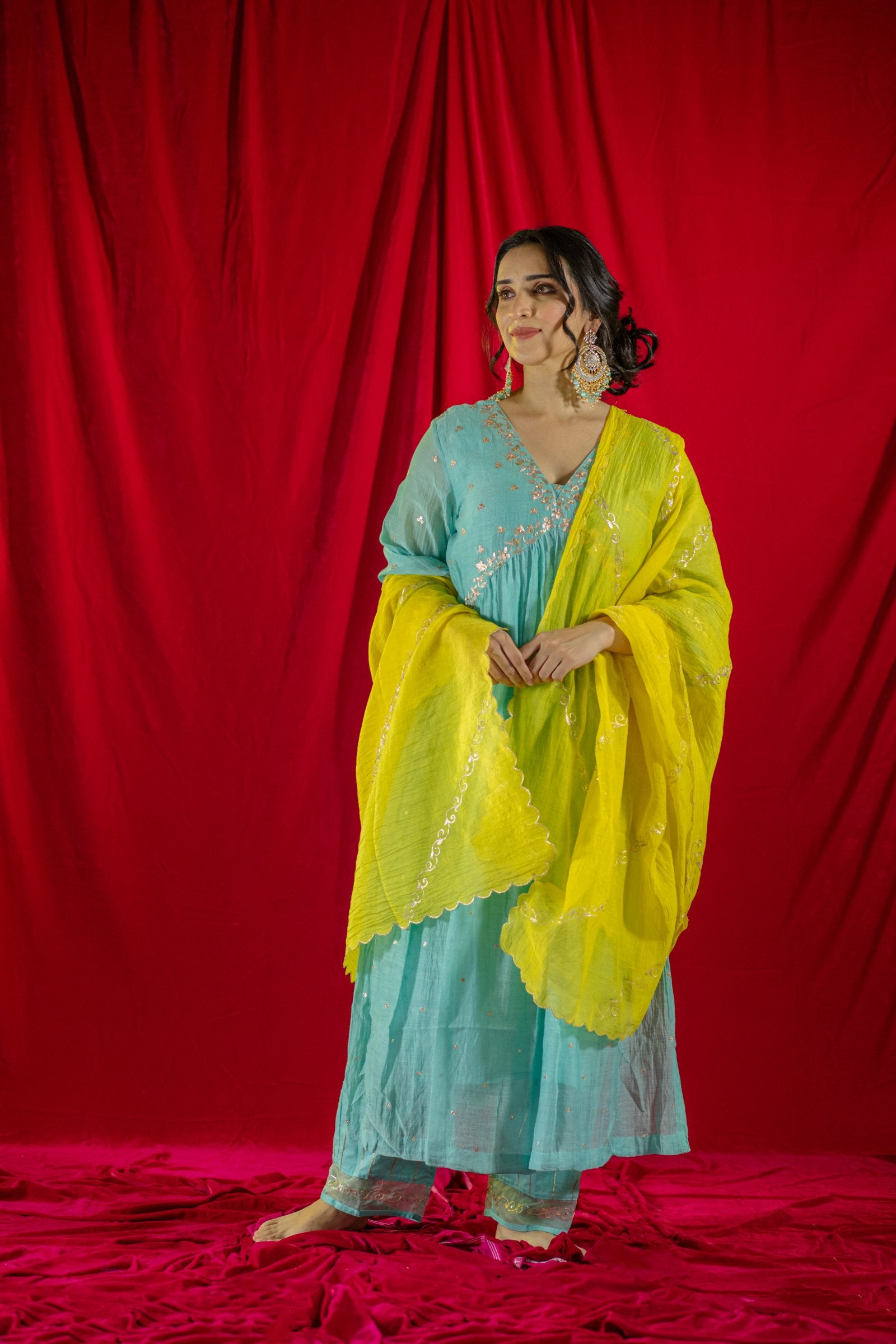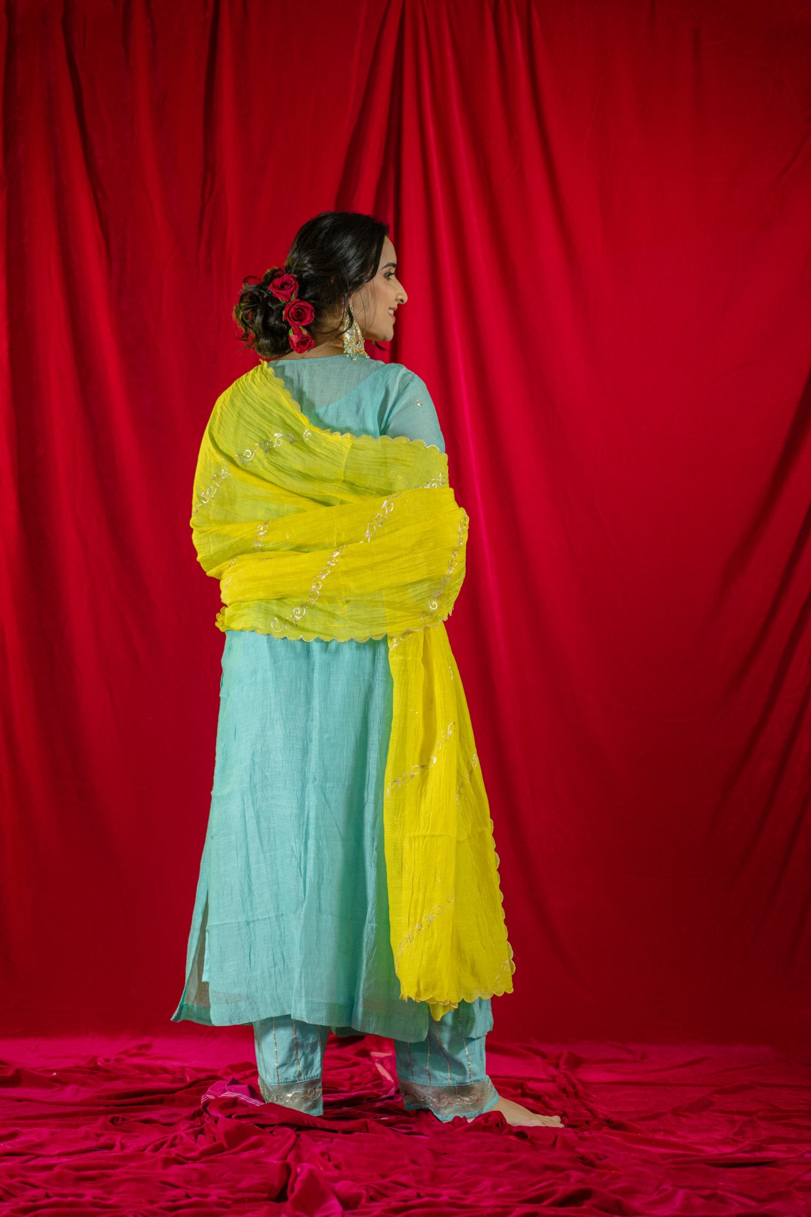 Featuring a handloom chanderi set with delicate pitta work on neckline and sprinkle of sitara motif on the yoke & sleeves. Comes with straight cotton pants with a highlight of gotta patti work and Pink handloom chanderi dupatta with pitta work. |