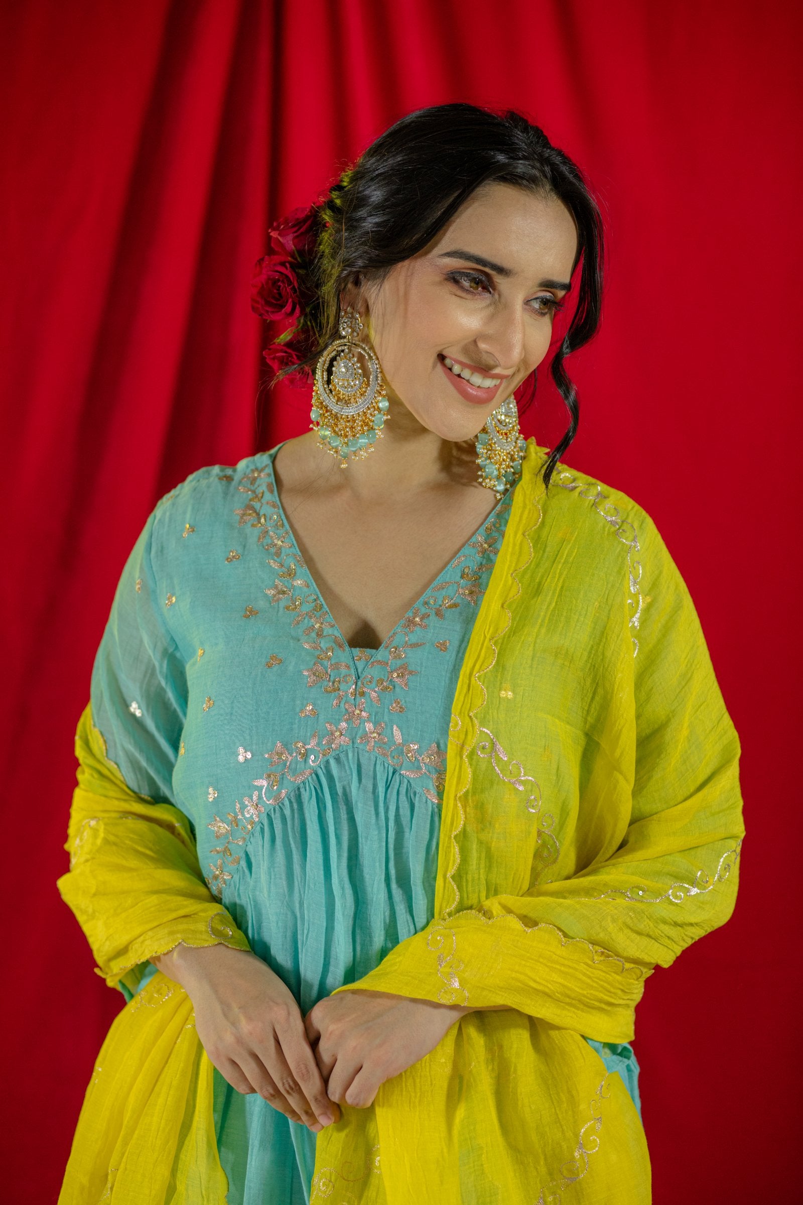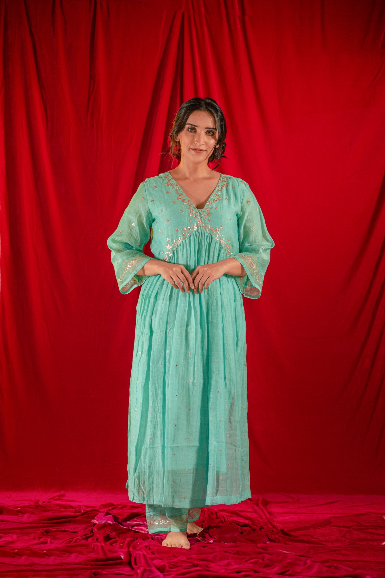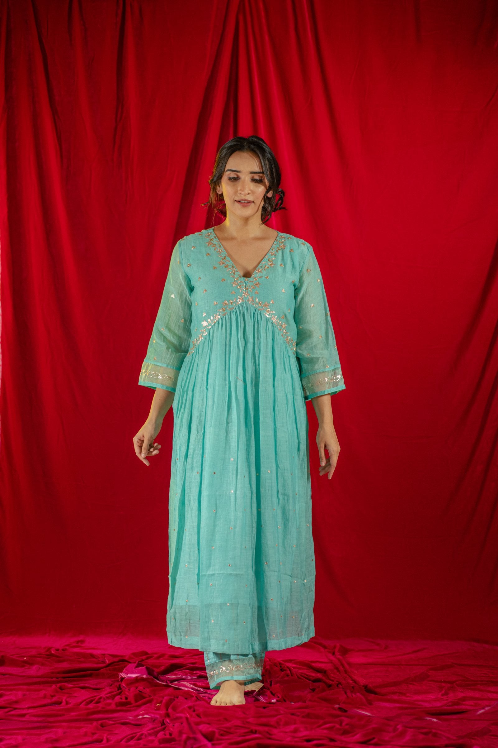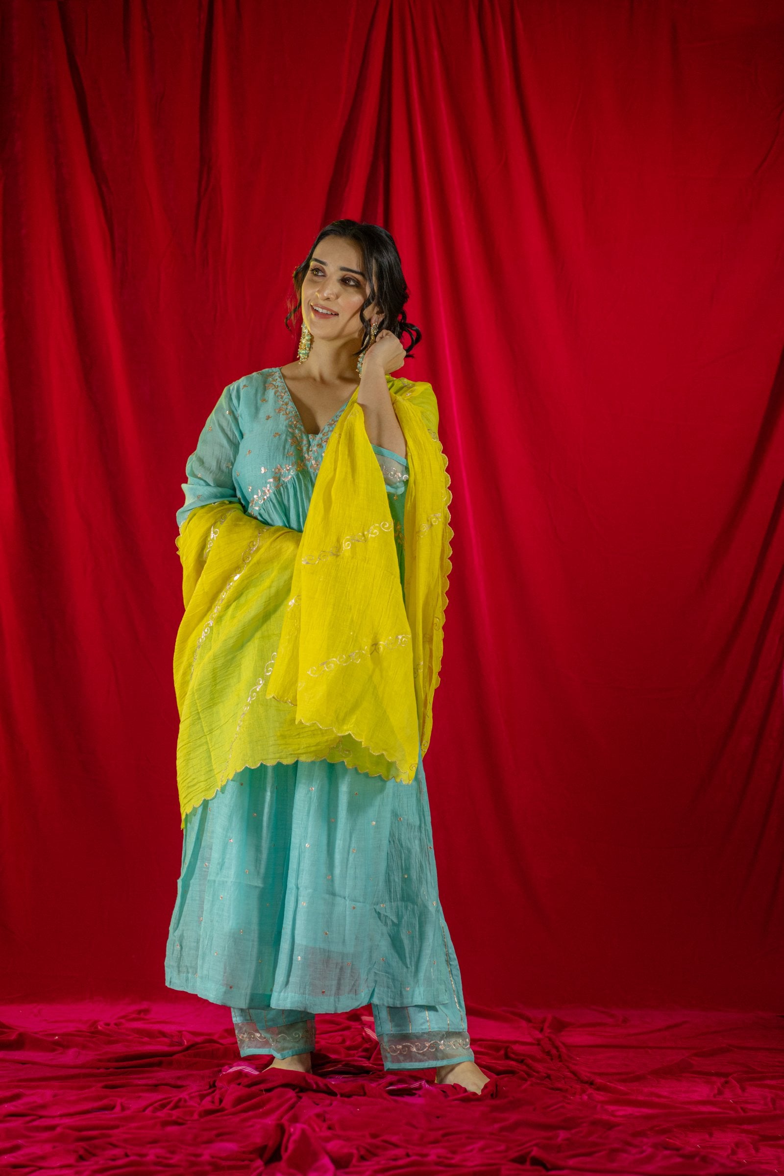 Featuring a handloom chanderi set with delicate pitta work on neckline and sprinkle of sitara motif on the yoke & sleeves. Comes with straight cotton pants with a highlight of gotta patti work and Pink handloom chanderi dupatta with pitta work. |