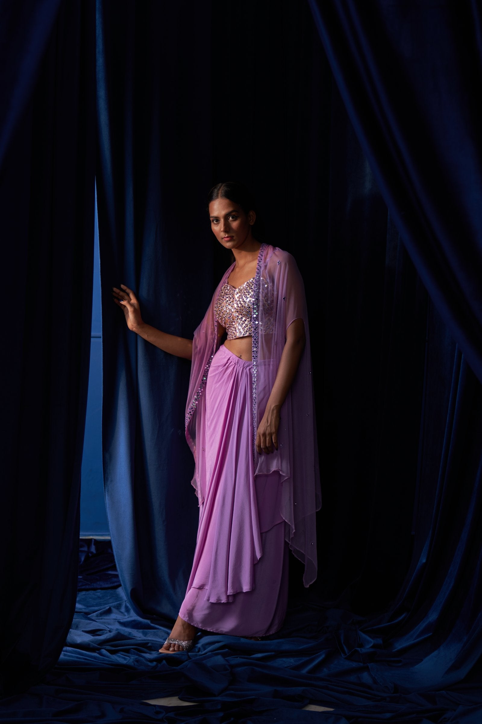 Featuring a cape skirt set in lilac. The blouse consists of a rose gold woven fabric with lilac patra work all over. The cape is in soft net with a patra work border on front panels. It comes long with a crepe draped skirt.