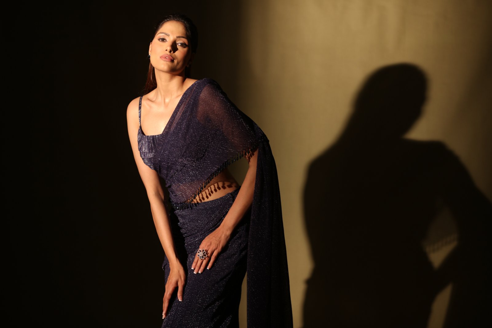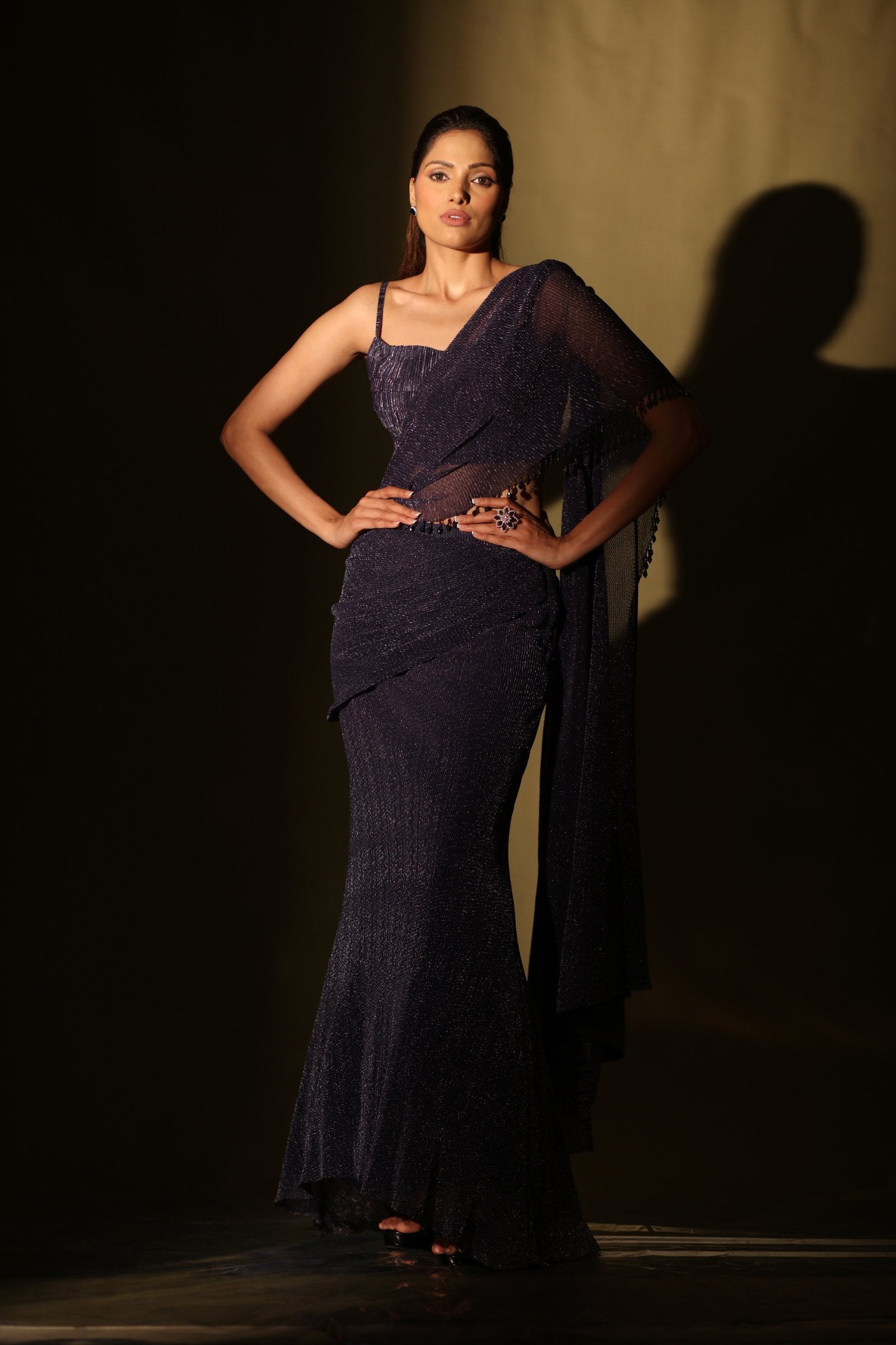 Featuring an midnight blue stitched saree with a detachable pallu in crinkle chiffon.