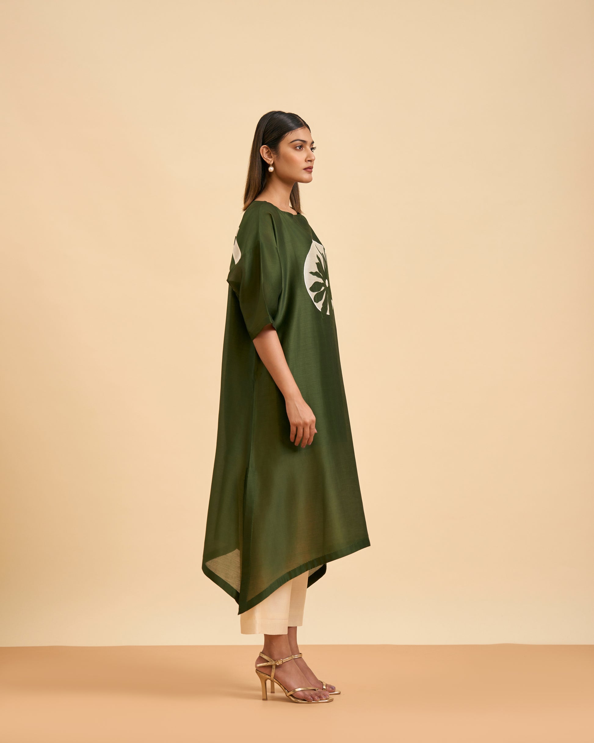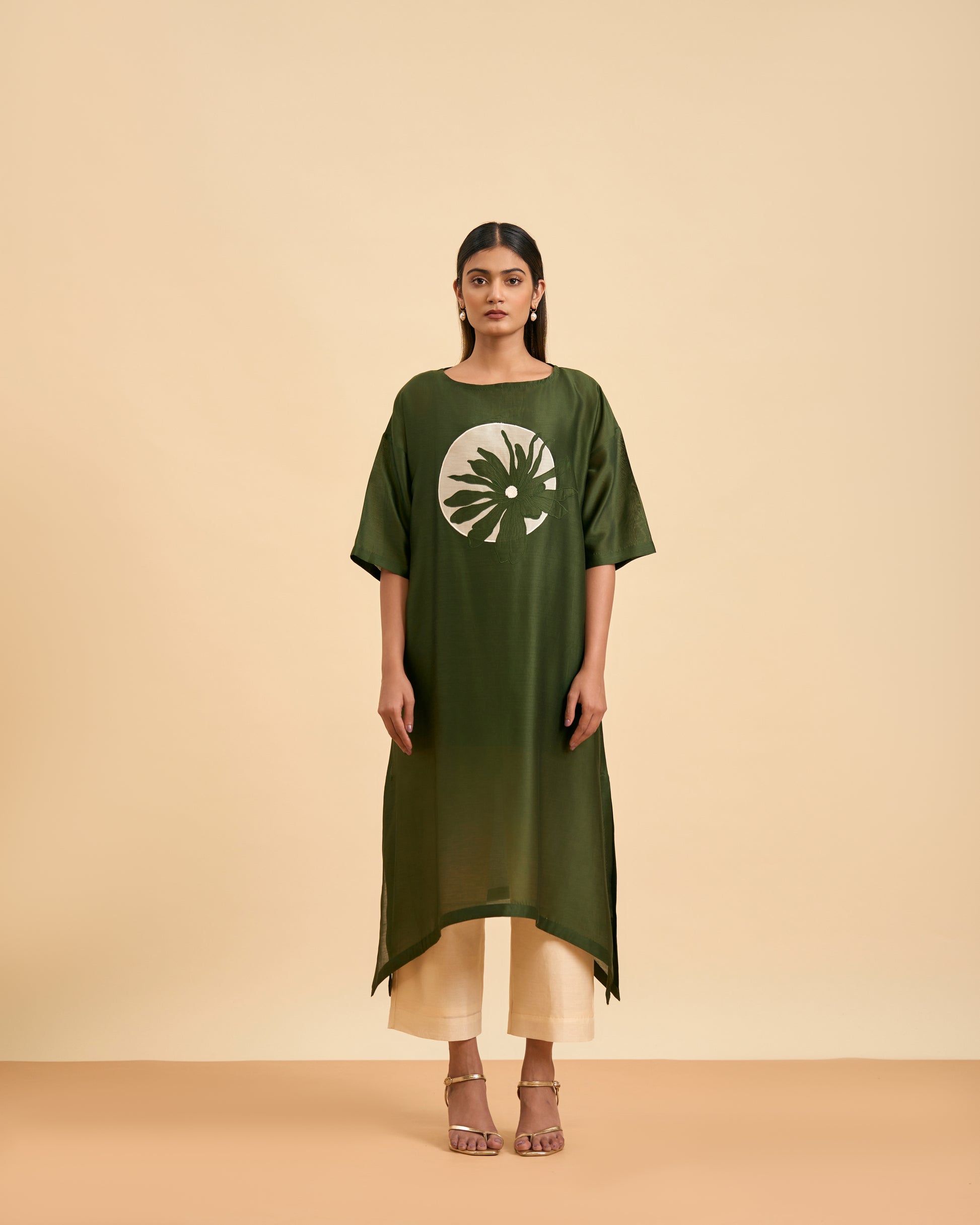 Olive coloured long kurta with a dipped hemline and elegant boat neck exudes effortless style. The dropped shoulder design, 3/4th sleeves, and front panel appliqué add a modern touch. Paired with ankle-length straight-fit pants, this ensemble blends comfort with sophistication.