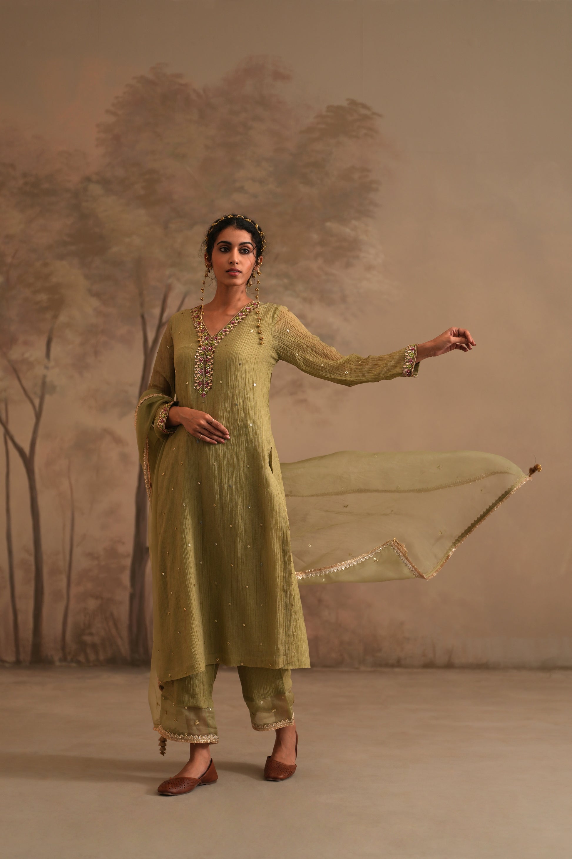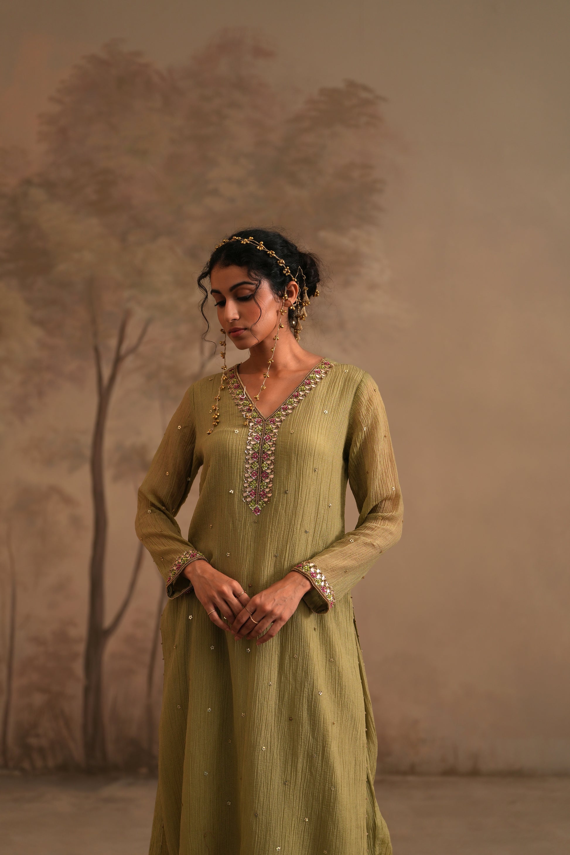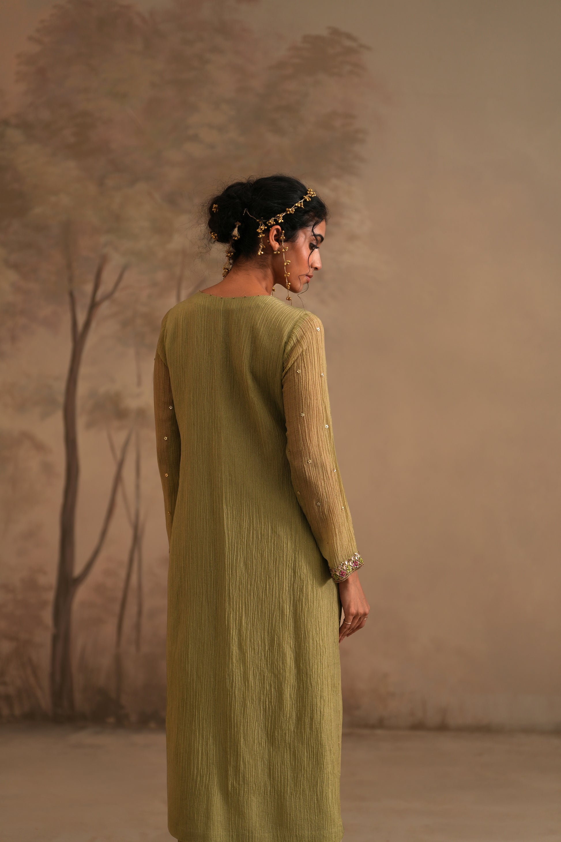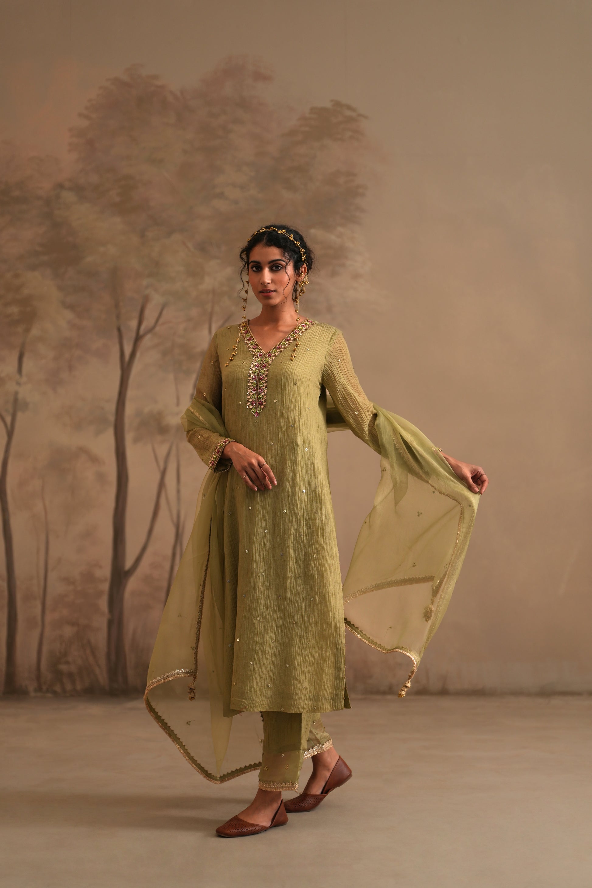 Olive Green Crushed Muslin Kurta with Zardozi and Gota embroidery
