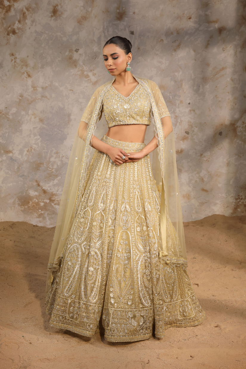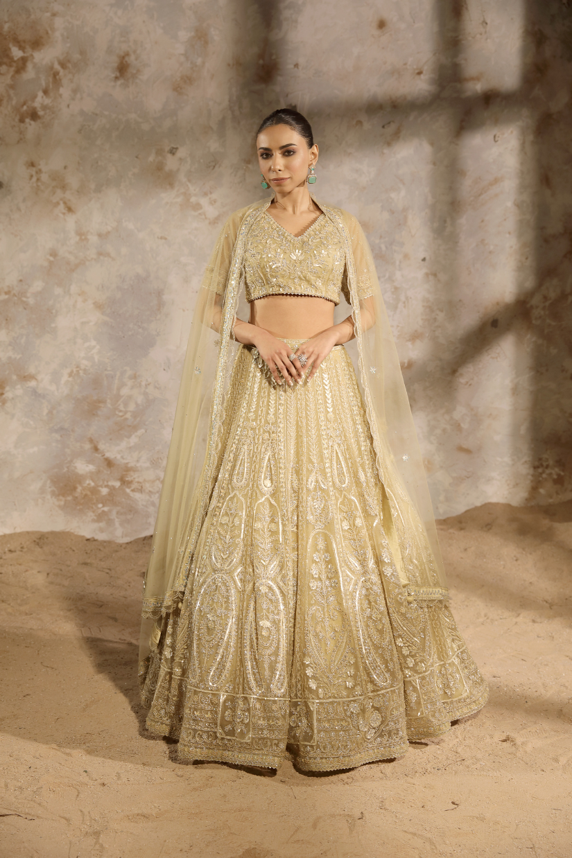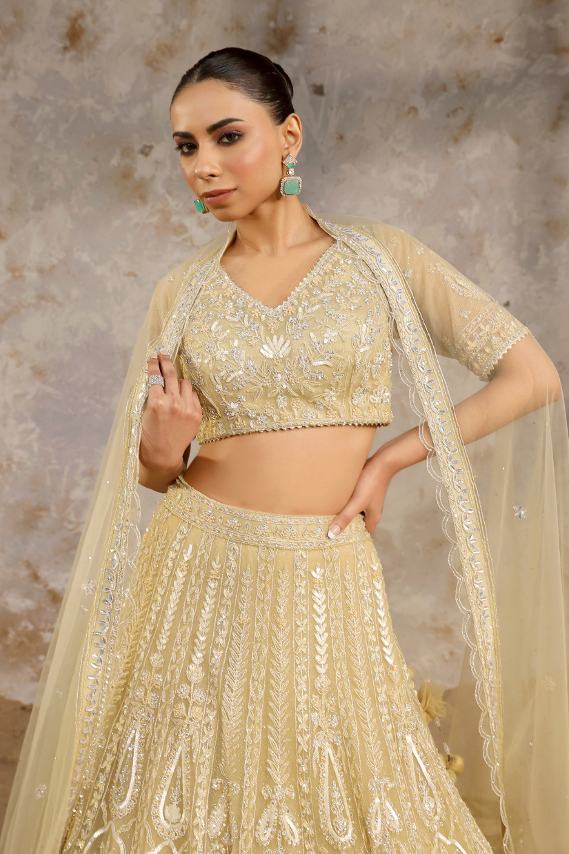 Introducing our exquisite pastel yellow heavy lehenga set, perfect for both brides and bridesmaids. Crafted with meticulous detail, the blouse and lehenga dazzle with tonal cluster sequins, zari, pearls, and delicate stone work, creating an enchanting ensemble. The intricate embroidery showcases long paisleys and intricate floral motifs, adding an air of timeless elegance to the attire. Accompanied by a coordinated dupatta, adorned with an embroidered border and scattered with matching embroidery throughout, this set is a true masterpiece of craftsmanship. The soft pastel hue exudes a sense of sophistication, while the opulent embellishments ensure all eyes are on you.