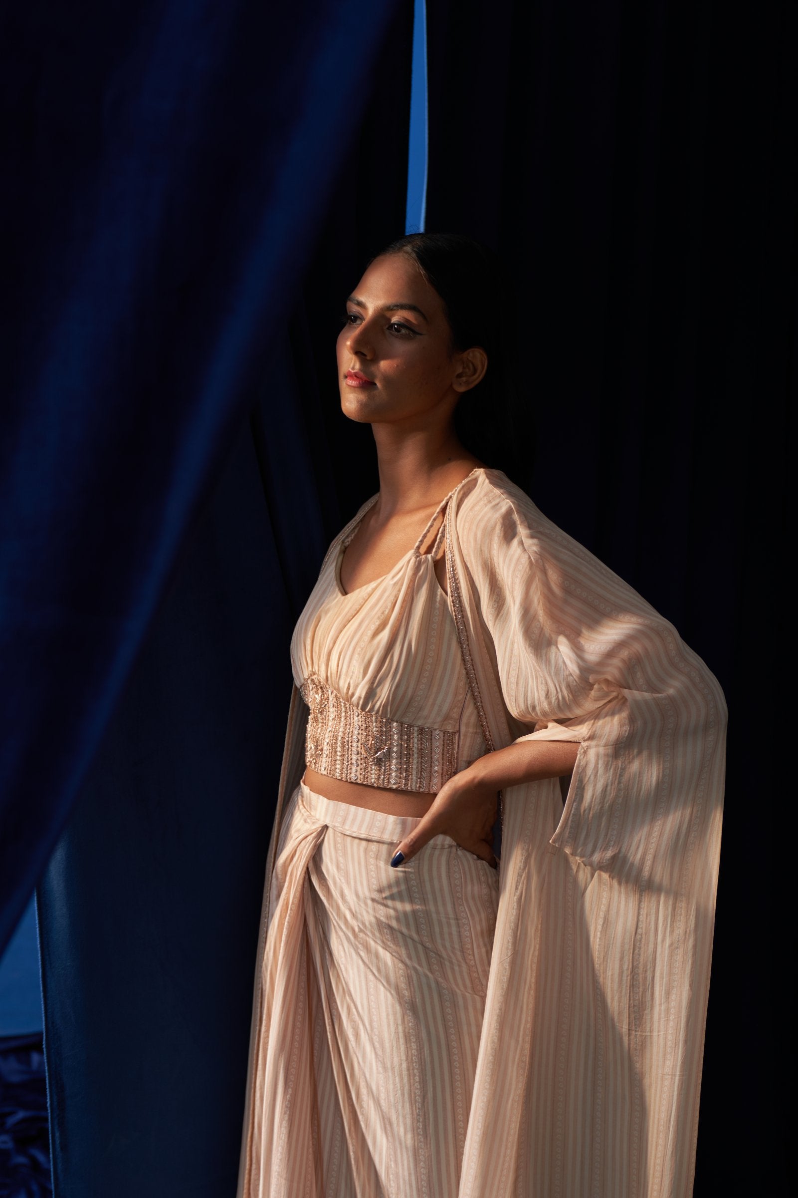 Featuring a crepe printed cape skirt set in muted peach and ivory. The kaftan cape is full length with light embellishment at the front panels. Blouse is rushed and has braid straps, the waistline is embroidered in a flattering shape. It comes along with a draped skirt with pleats in the middle.
