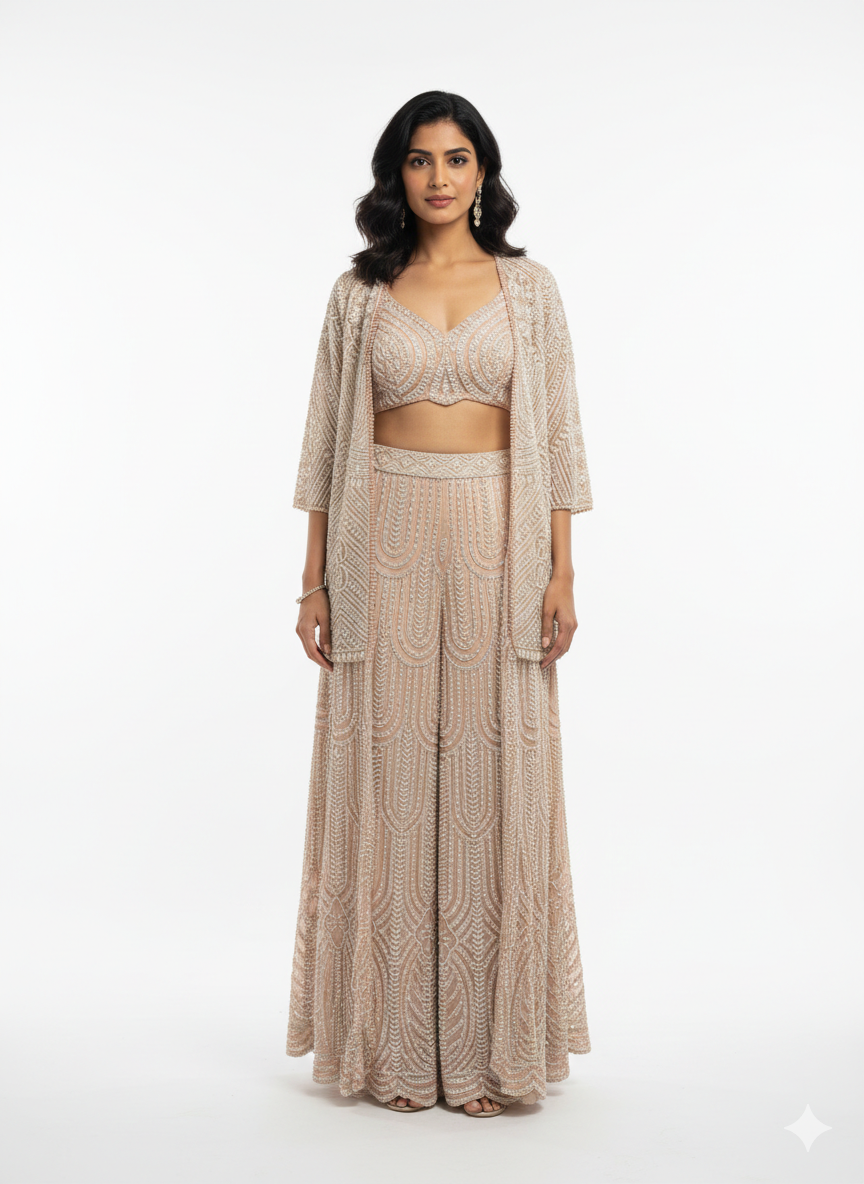 Featuring a blush pink Jacket Bustier and Pants set. Each part is fully mebellished with white moti and cutdana.
