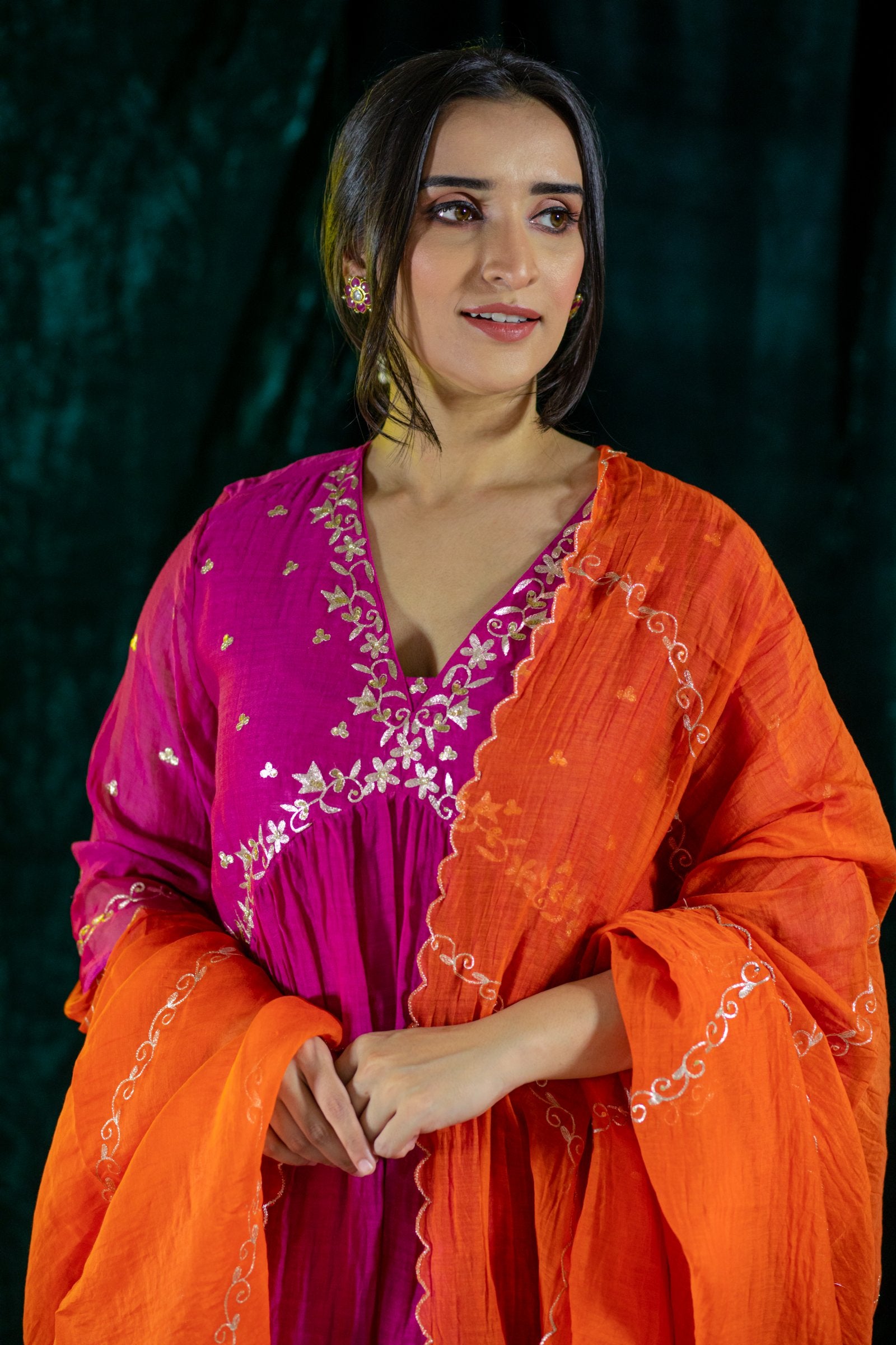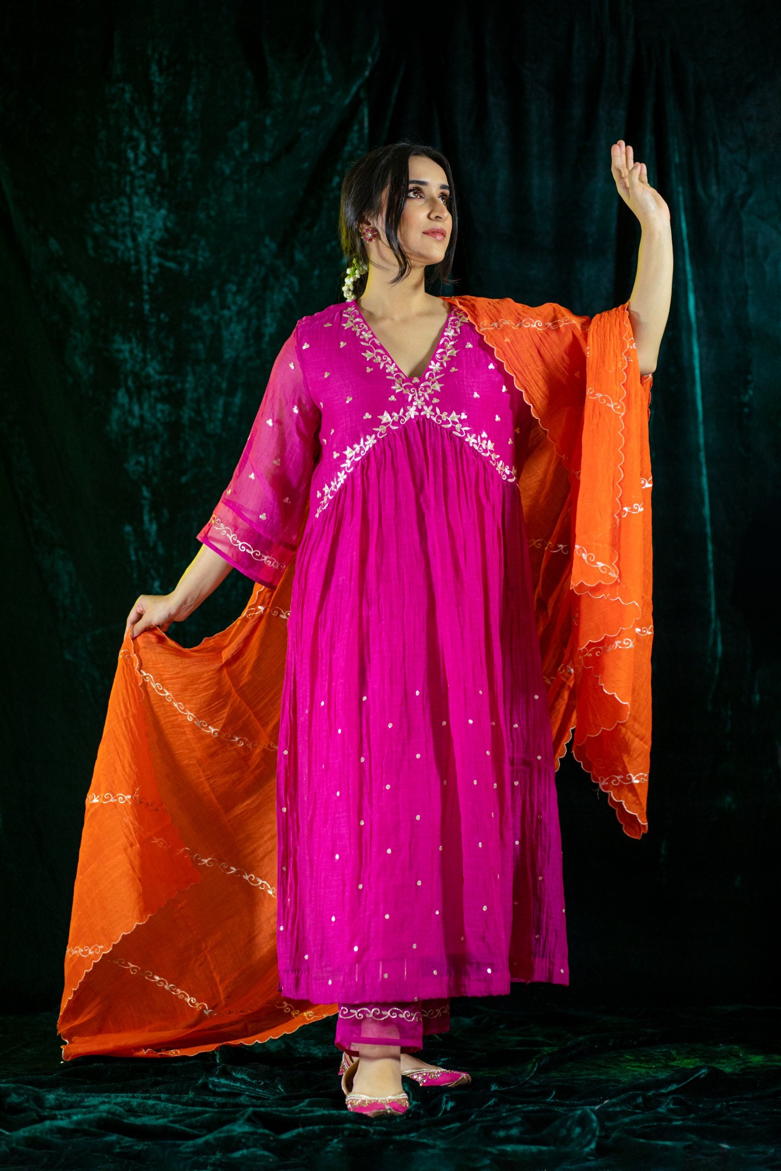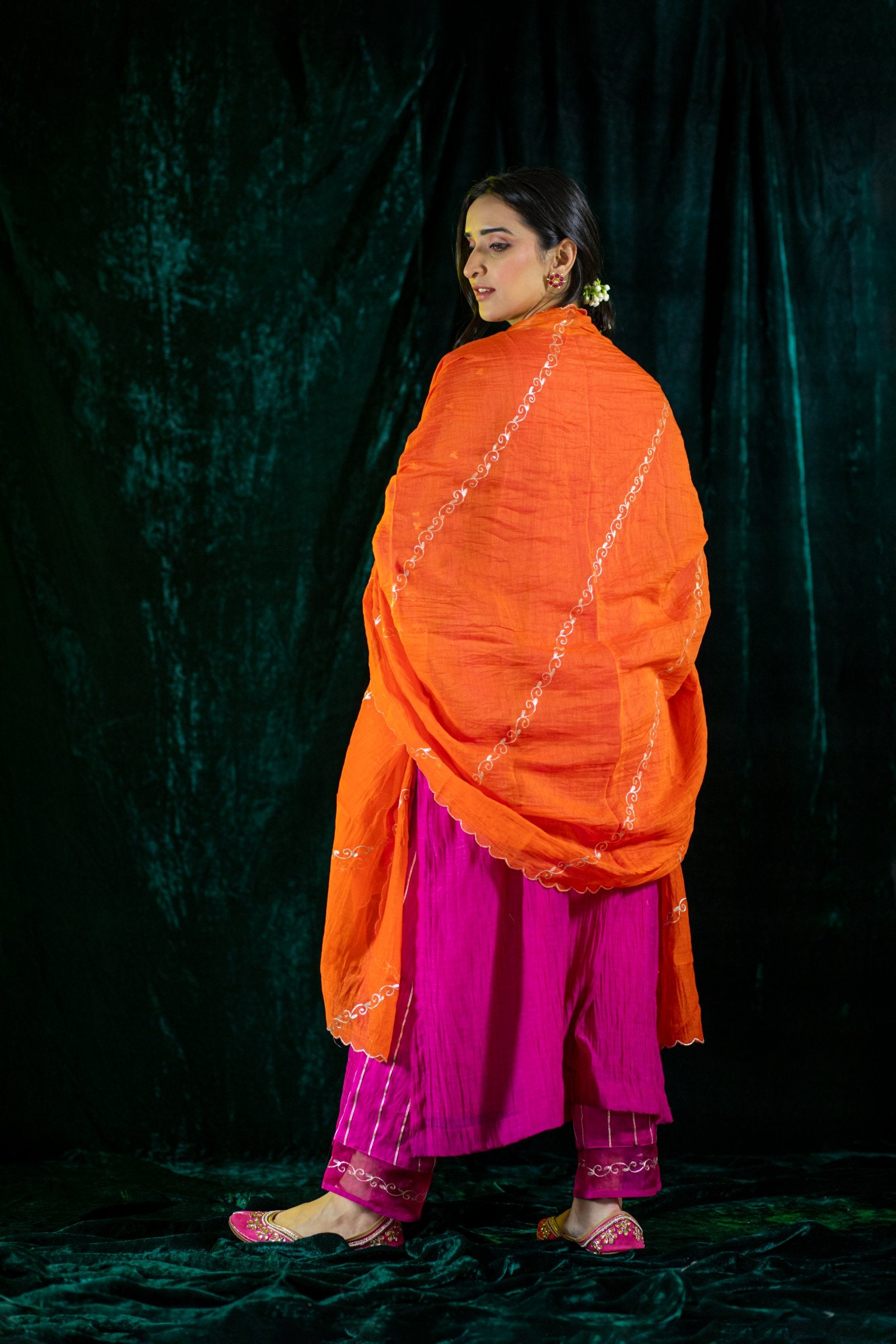 Featuring a handloom chanderi set with delicate pitta work on neckline and sprinkle of sitara motif on the yoke & sleeves. Comes with straight cotton pants with a highlight of gotta patti work and Pink handloom chanderi dupatta with pitta work. |