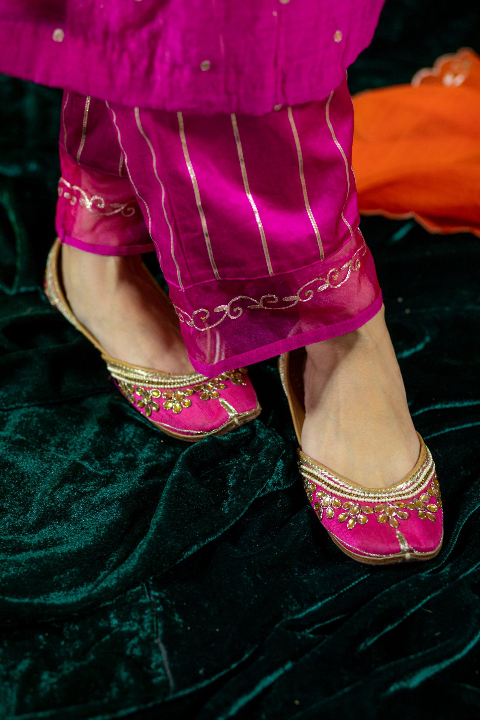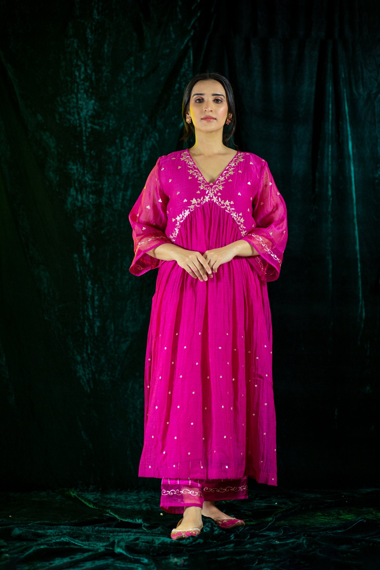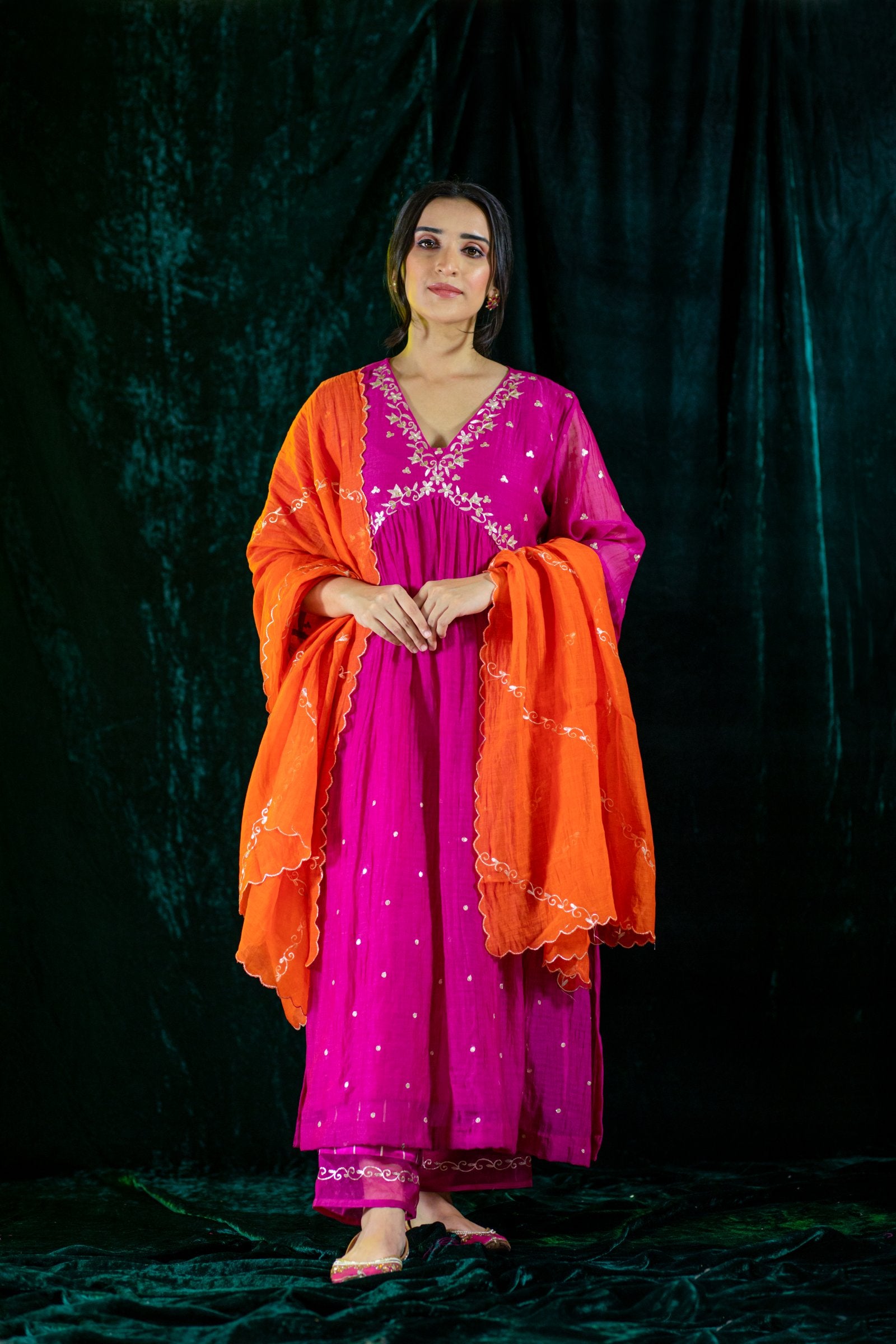 Featuring a handloom chanderi set with delicate pitta work on neckline and sprinkle of sitara motif on the yoke & sleeves. Comes with straight cotton pants with a highlight of gotta patti work and Pink handloom chanderi dupatta with pitta work. |
