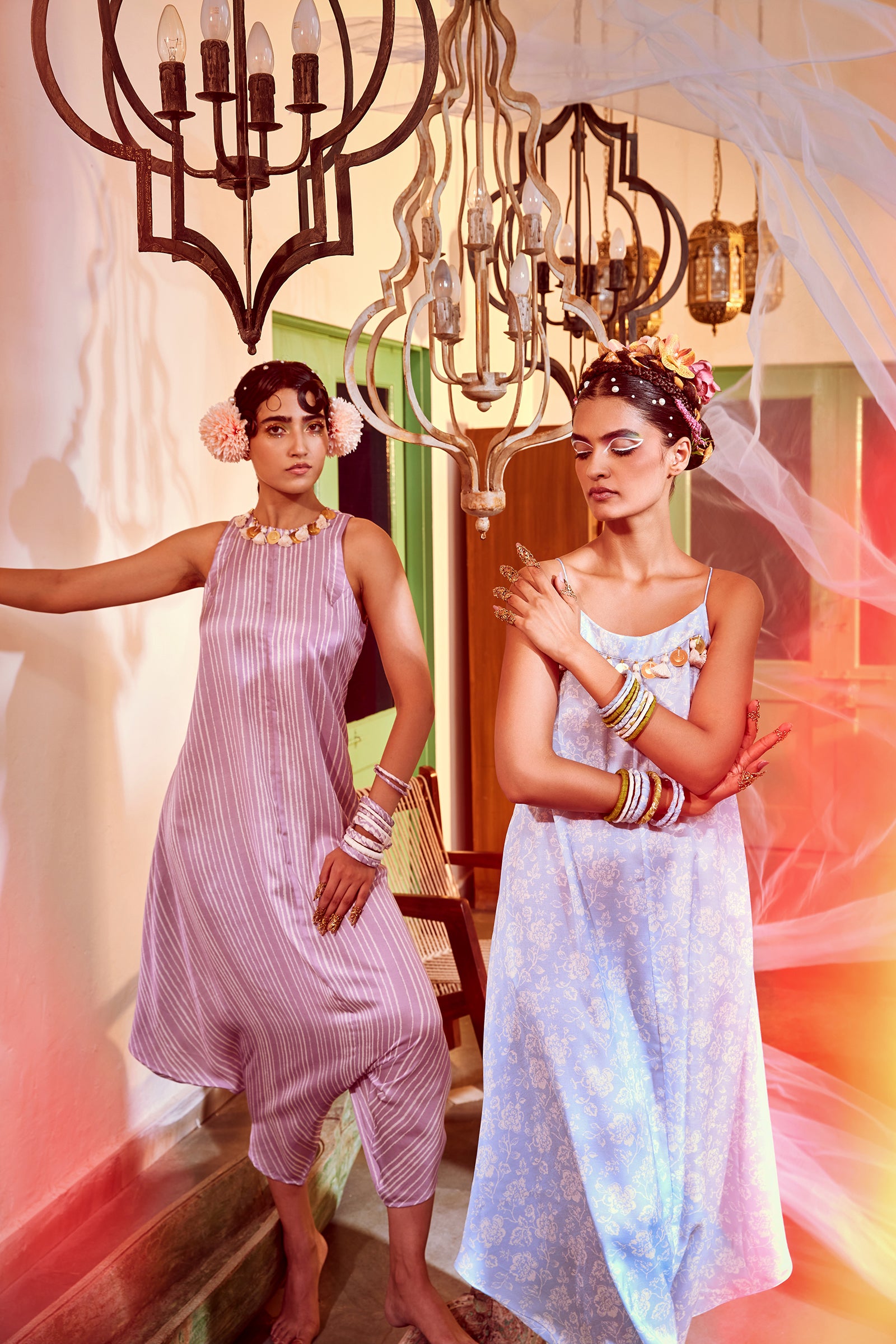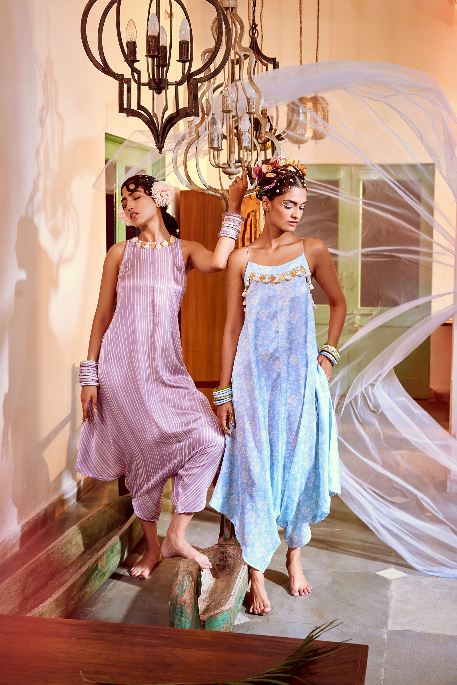 A Strappy printed Cowl Jumpsuit With Interesting Resham Tassels & Coin Detailing.