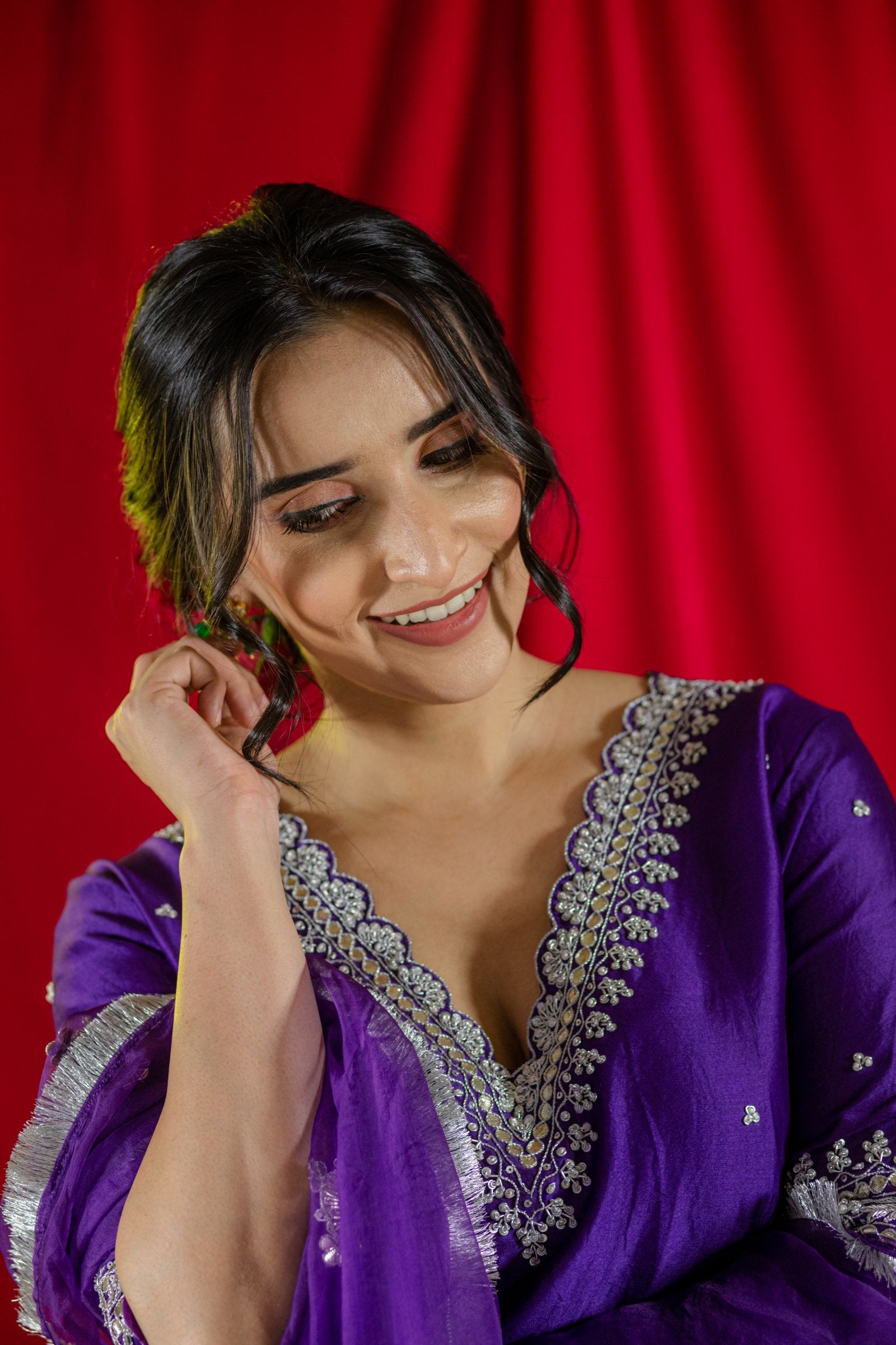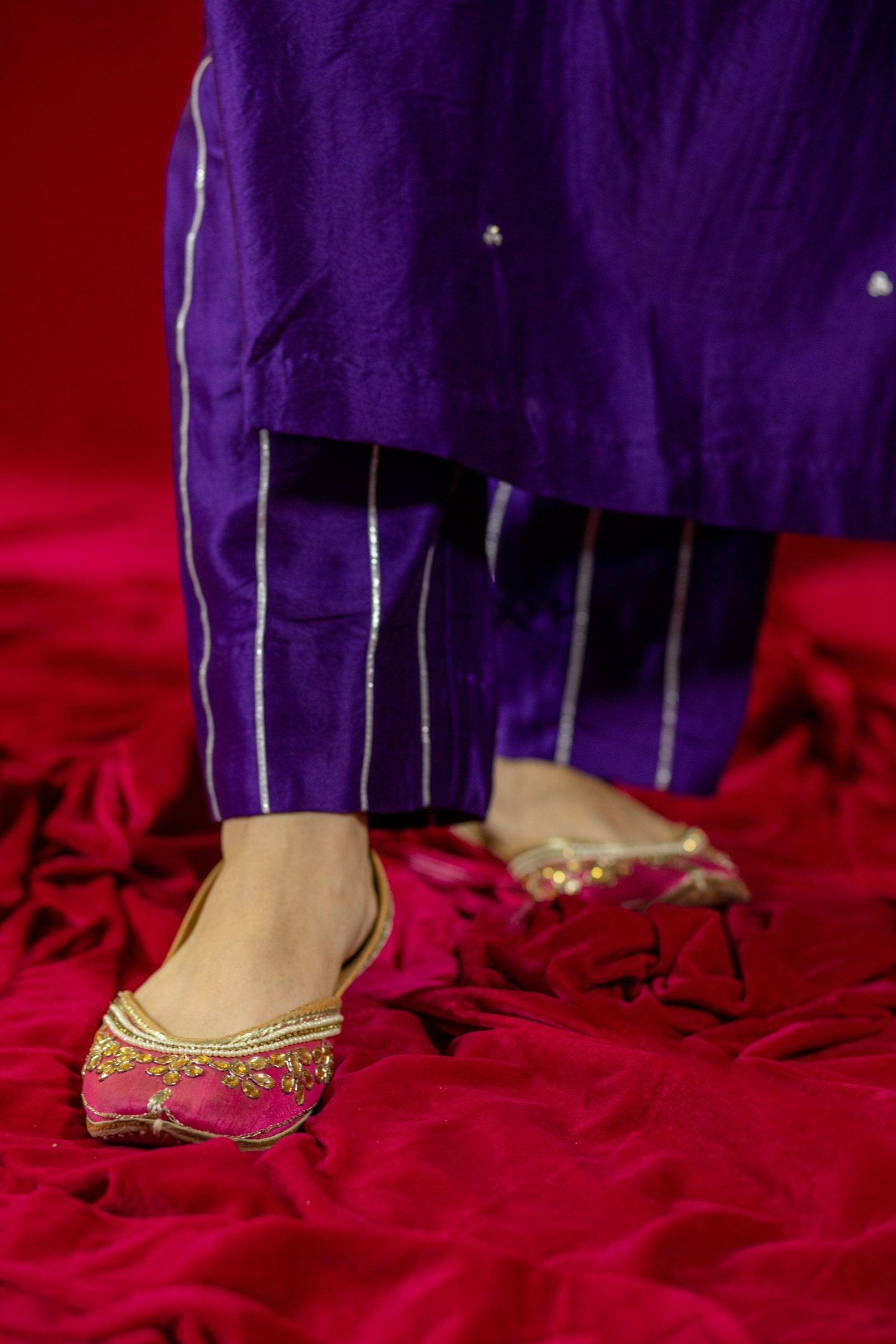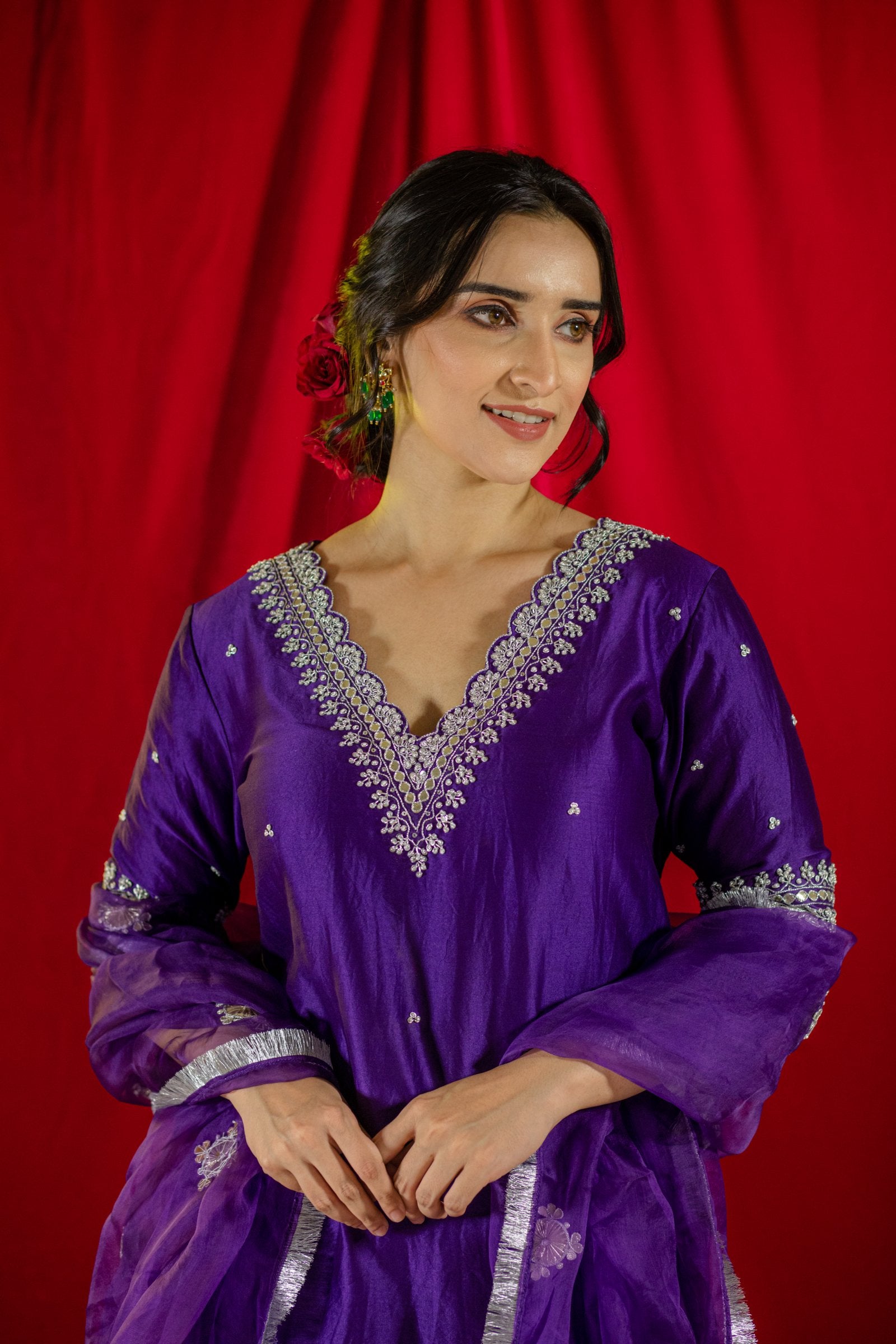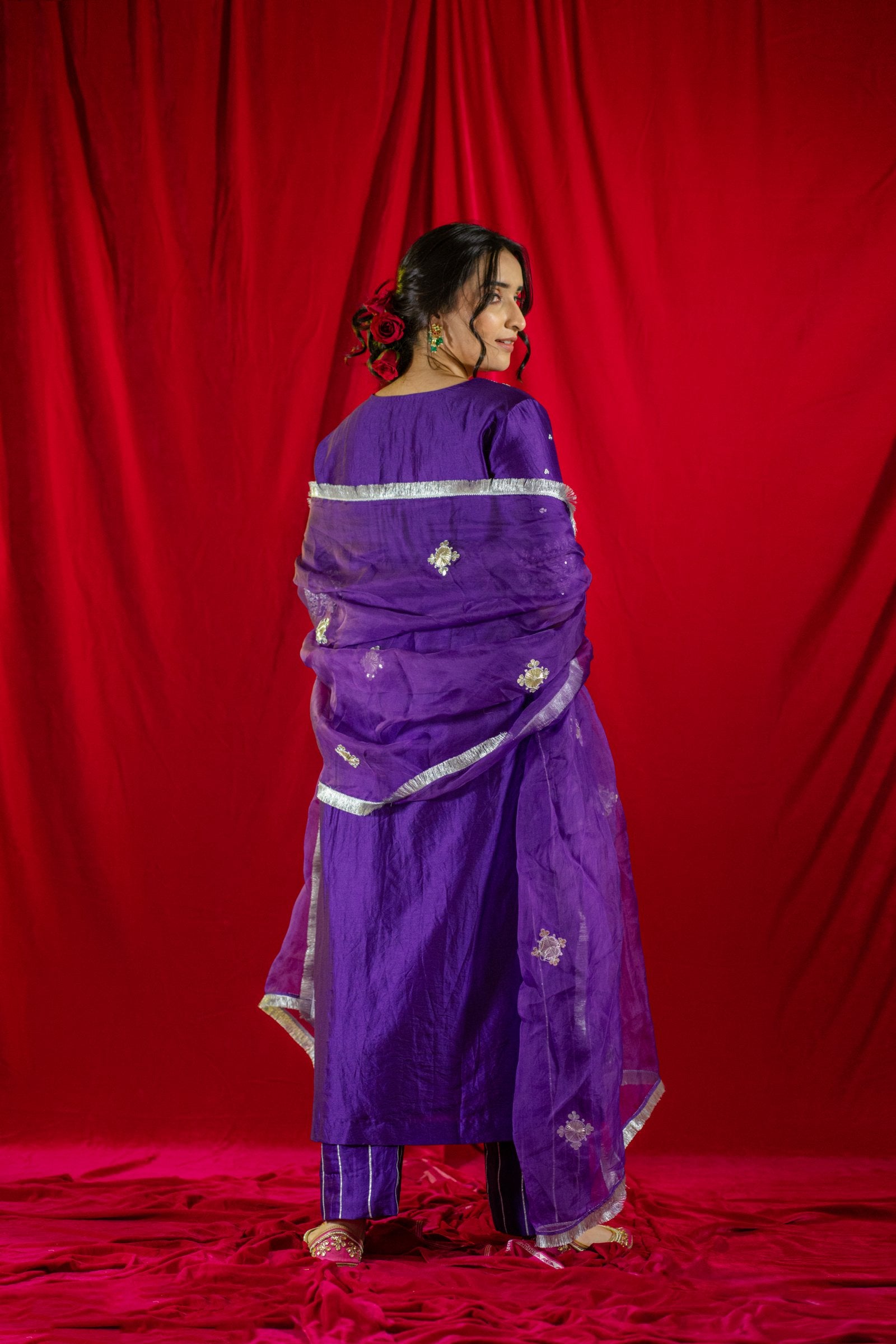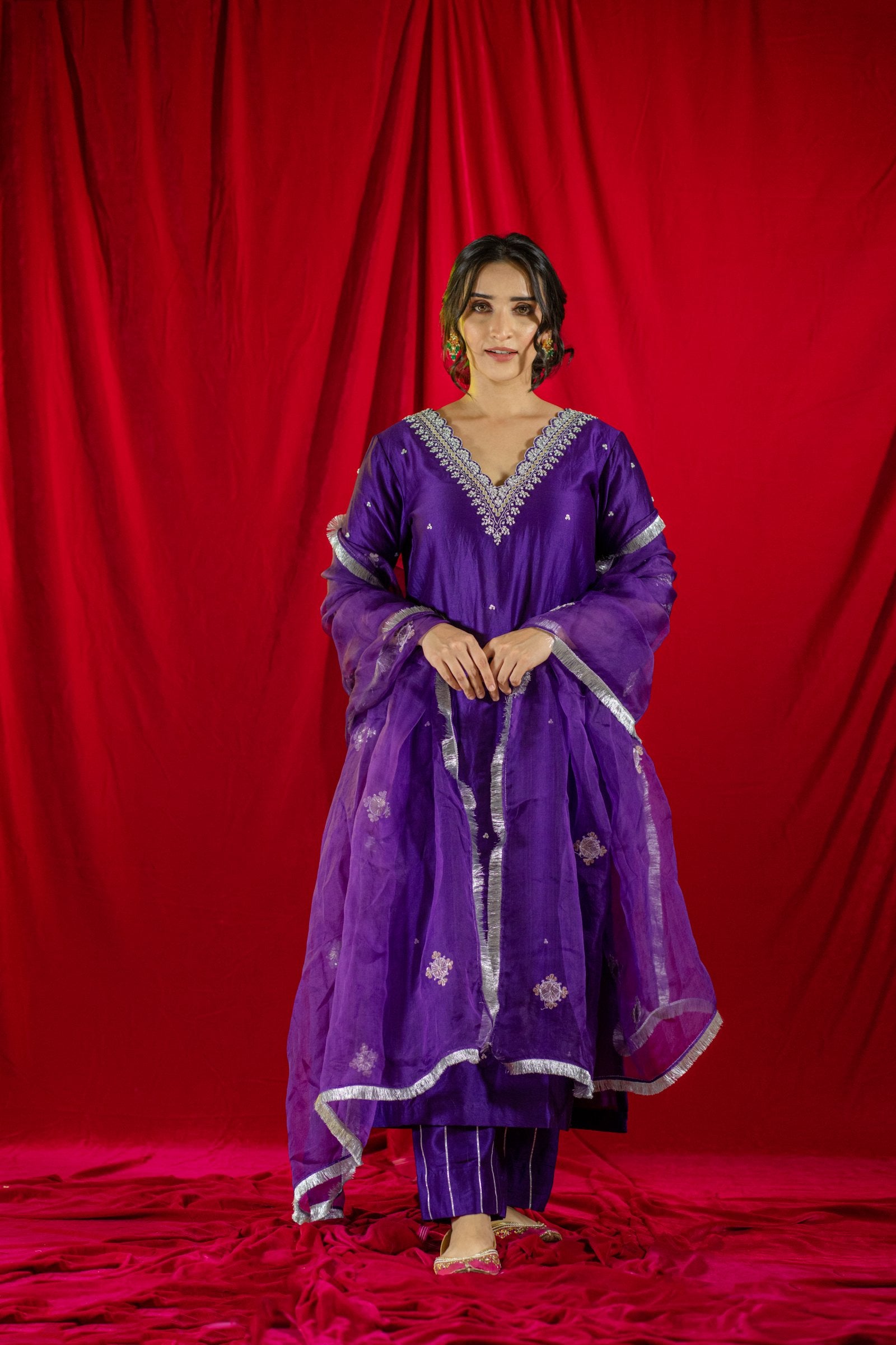 Featuring a chanderi silk kurta set with delicate gotta patti handwork highlighted with pearls on neckline and sleeves. Comes with straight Chanderi silk pants highlighted with gotta patti lines. This Set comes with organza dupatta with handcrafted motifs. |