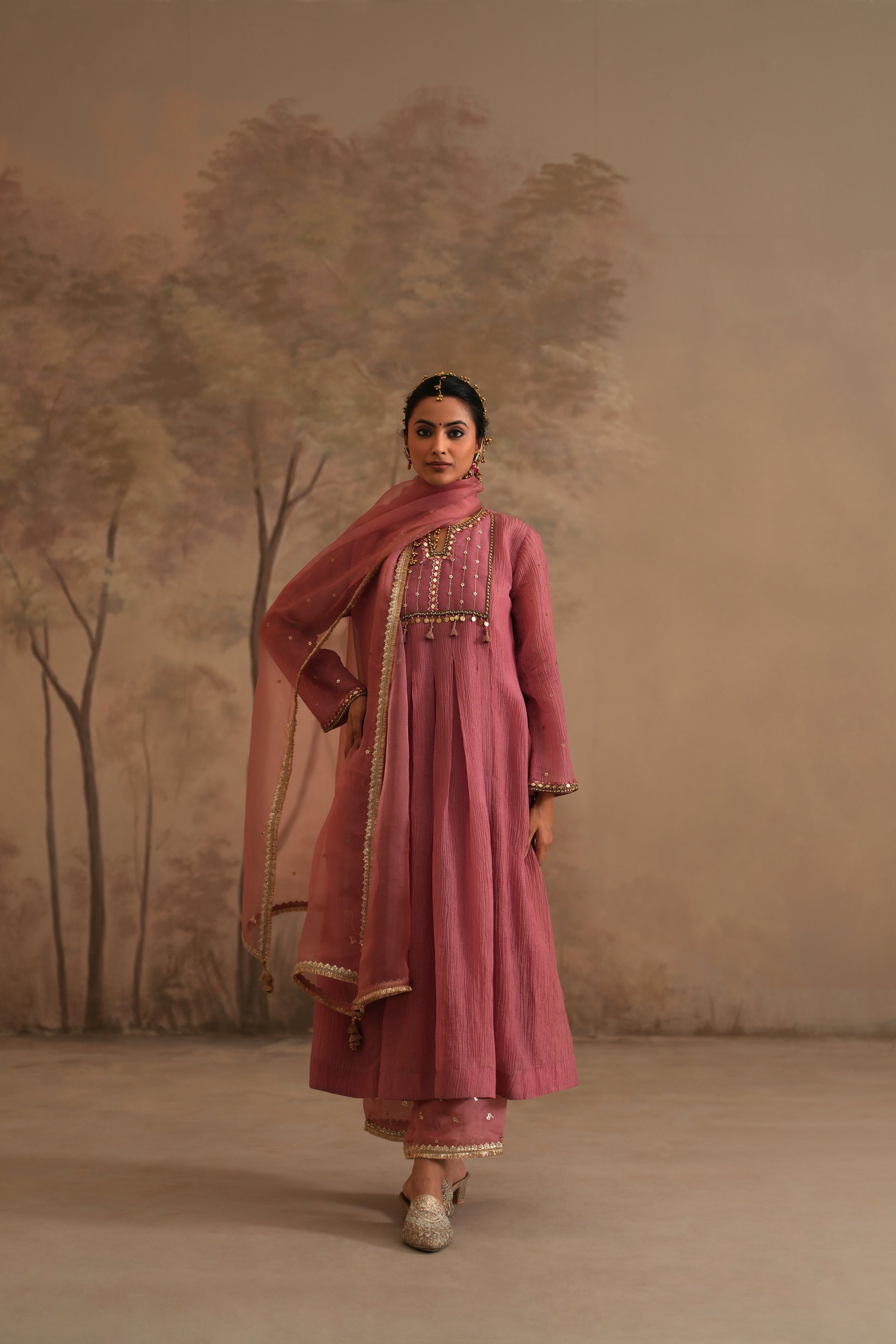 Rosebud Pink Crushed Muslin Kurta with Zardozi and Gota lines yoke