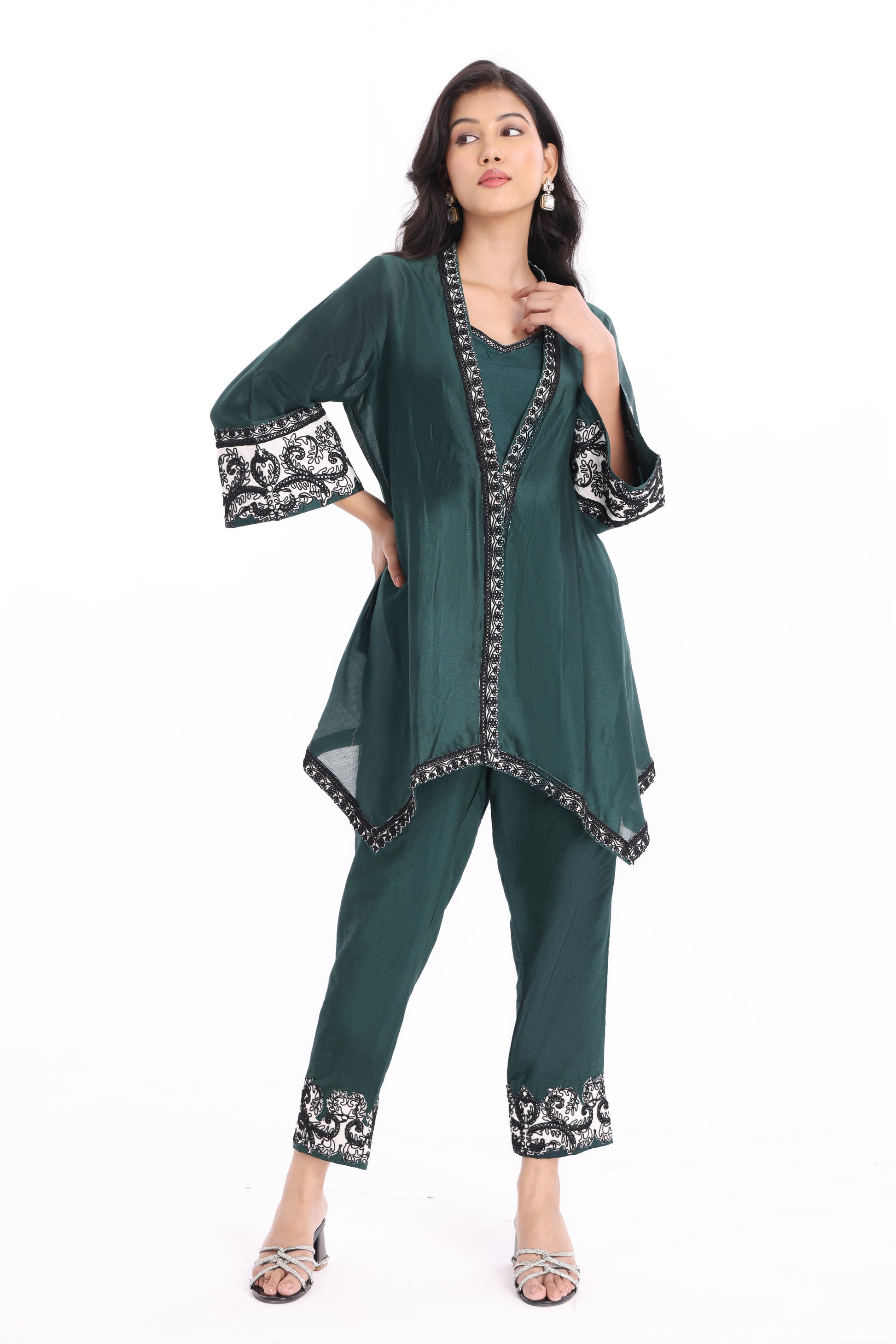 Featuring a smart indo western style outfit paired with straight pants.The outfit is embellished with machine embroidery with bell sleeves, Accentuate it with statement earings and smart heels for festive gatherings or intimate celebrations.