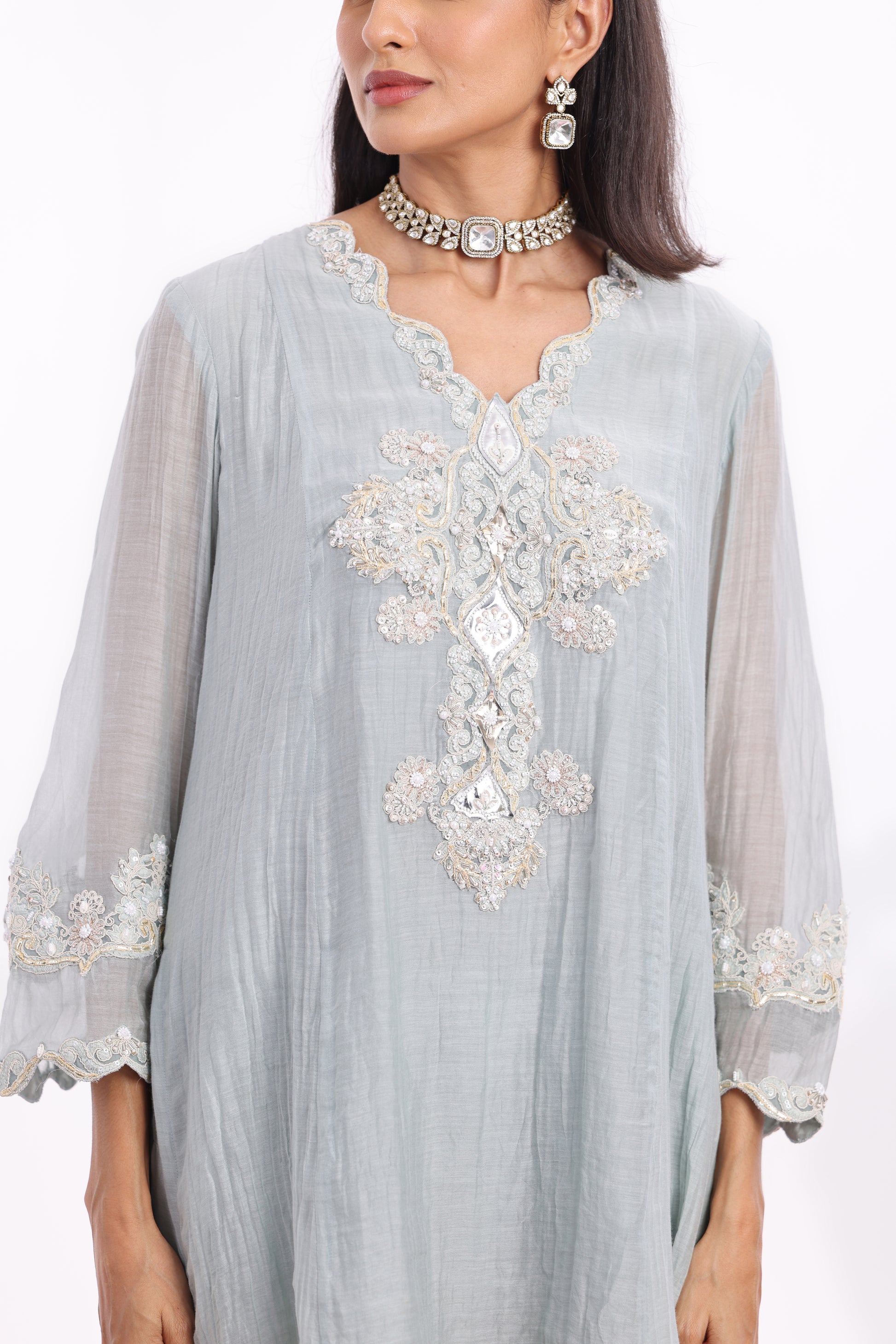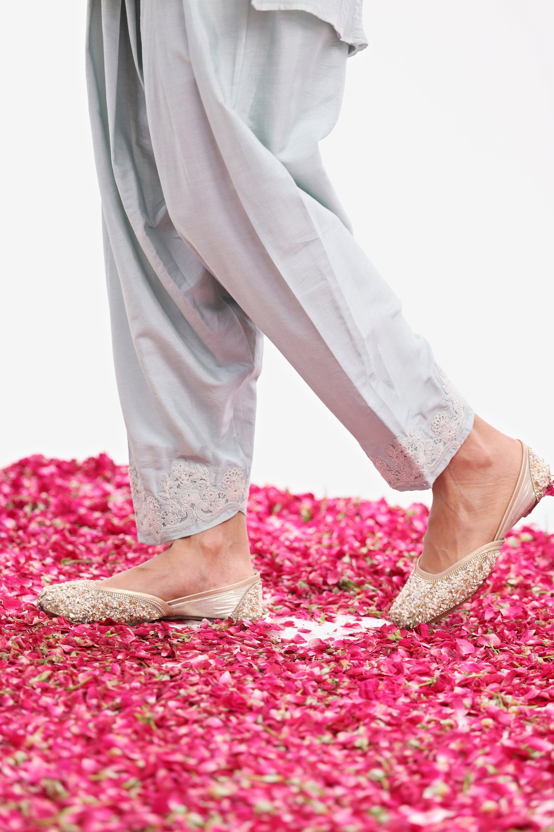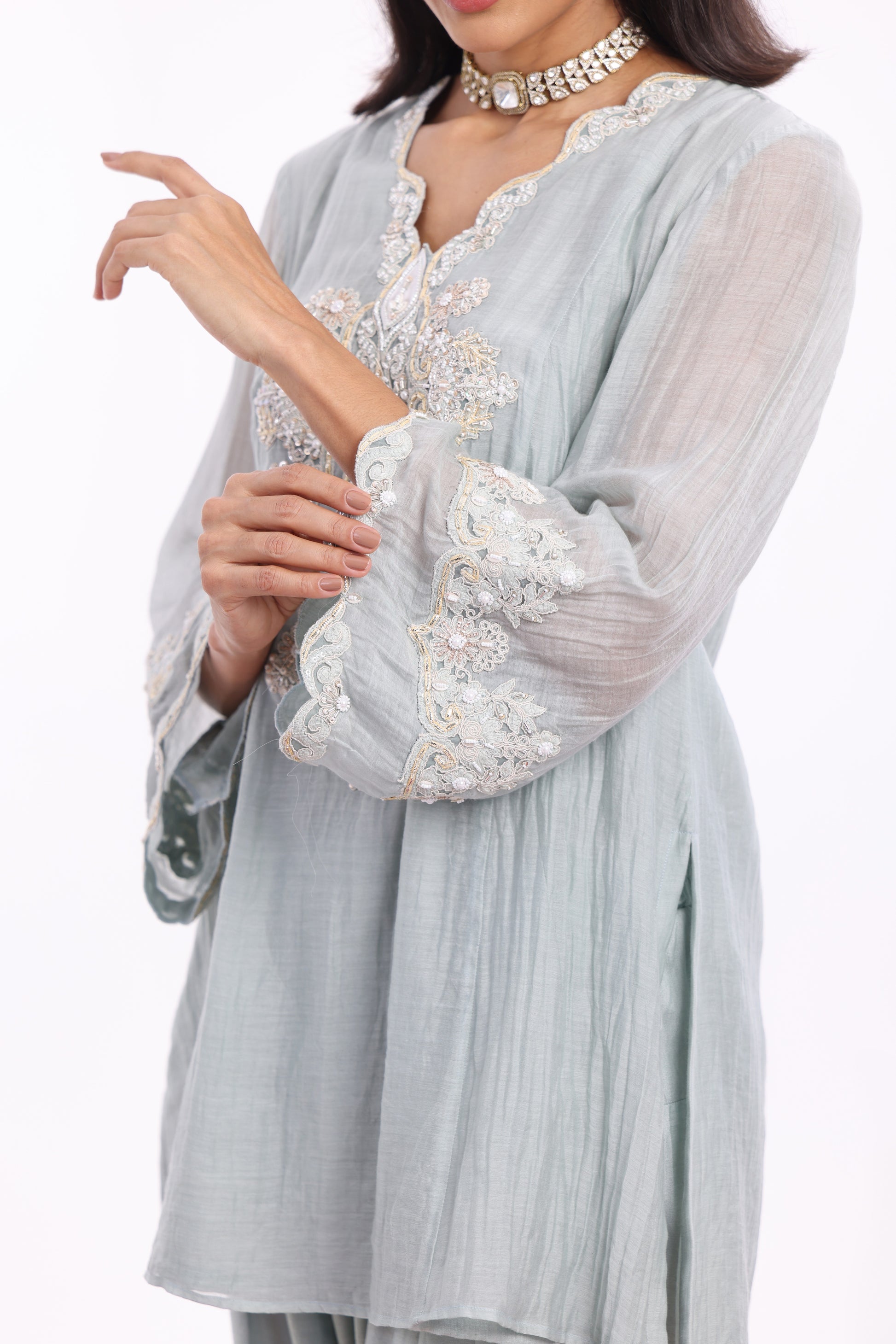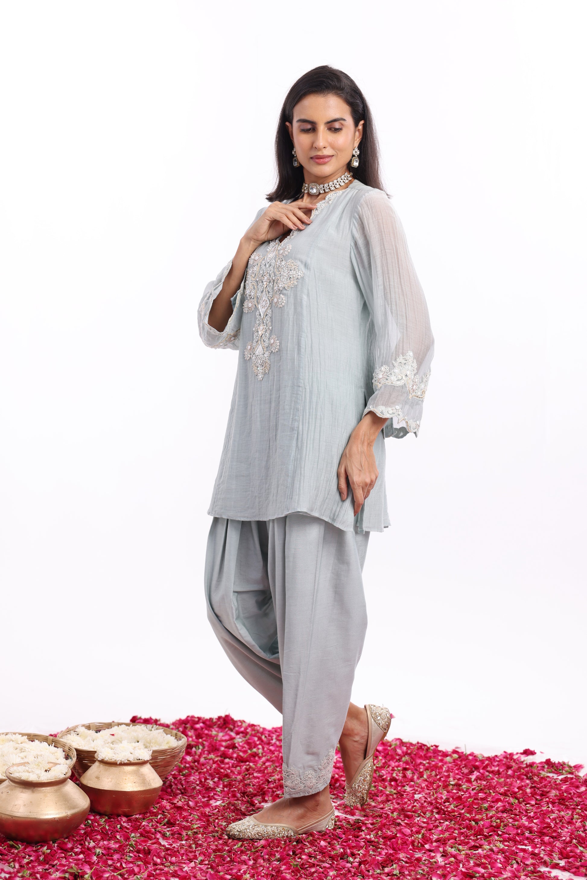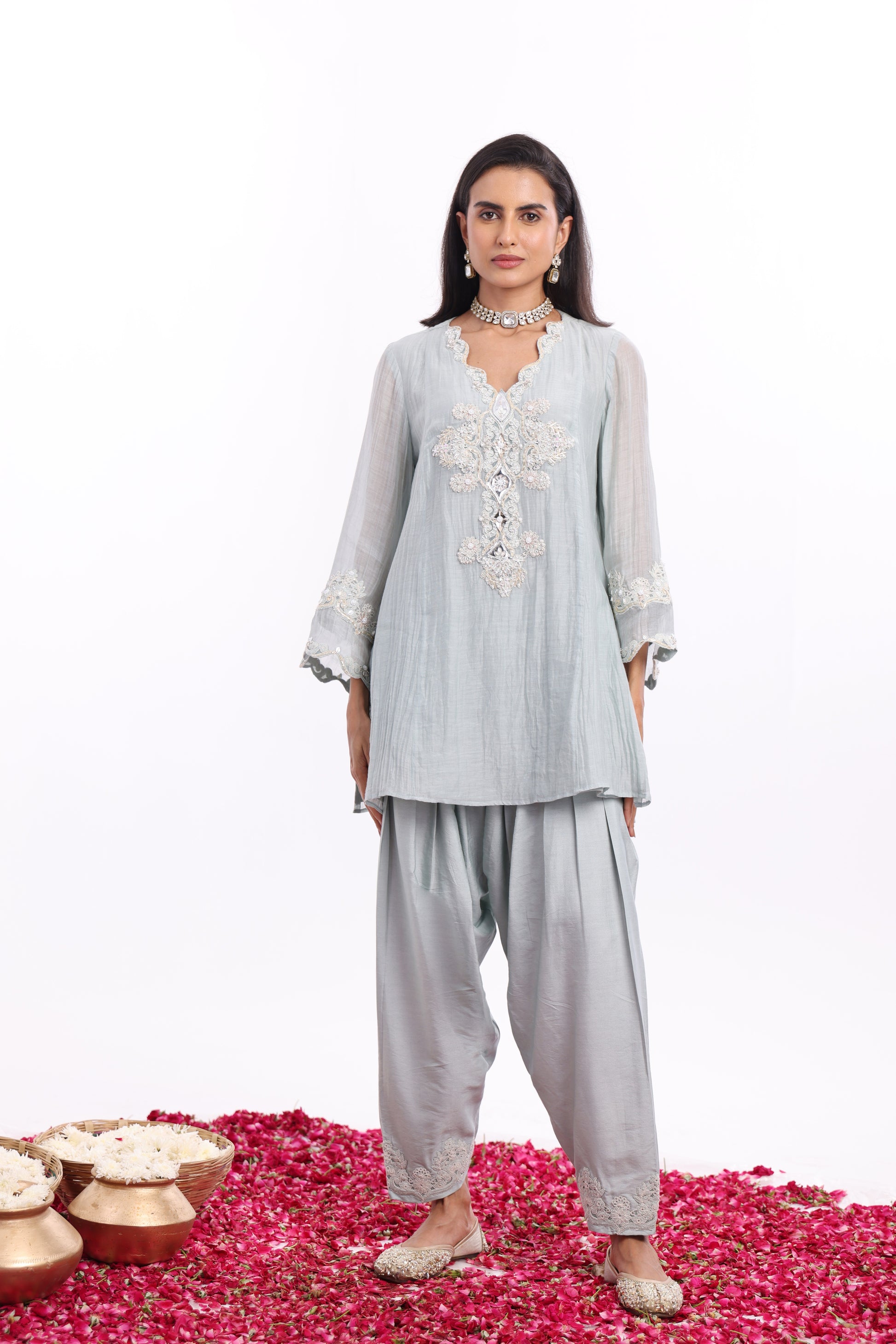 A richly adorned short kurta set with machine work embellished with hand embroidery work with bell sleeves, matched with equally ornate narrow salwar paired with traditional juttis for festive occasions
