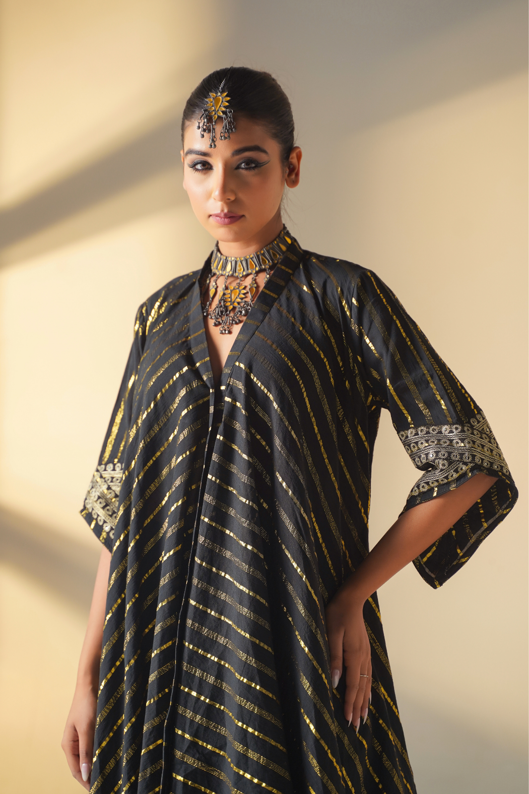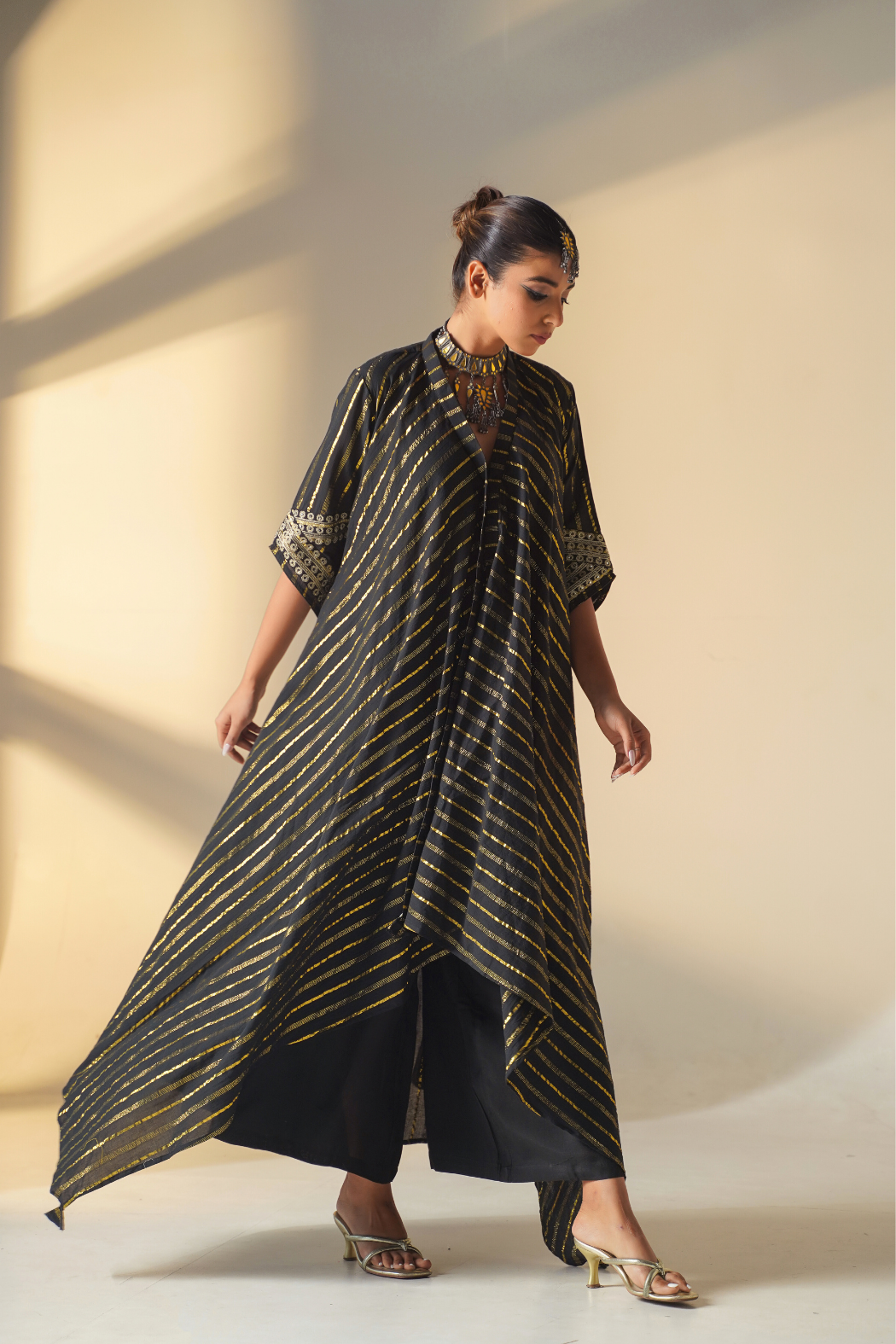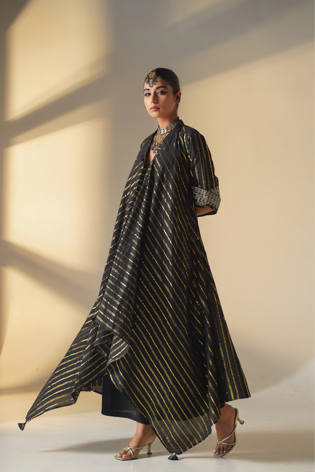Elevate your style with our stunning handkerchief-cut kurta set, a modern take on traditional attire. Crafted from luxurious striped lurex fabric, this ensemble is designed to enhance your height while exuding elegance. The flattering v-neckline adds a touch of sophistication, complemented by slant embellished sleeves adorned with intricate gold threadwork. Perfect for any occasion, whether it's a formal event or a casual outing, this set includes both the kurta and pants for a complete look. Embrace the allure of asymmetry and make a fashion statement with this must-have ensemble that seamlessly blends contemporary design with timeless charm.